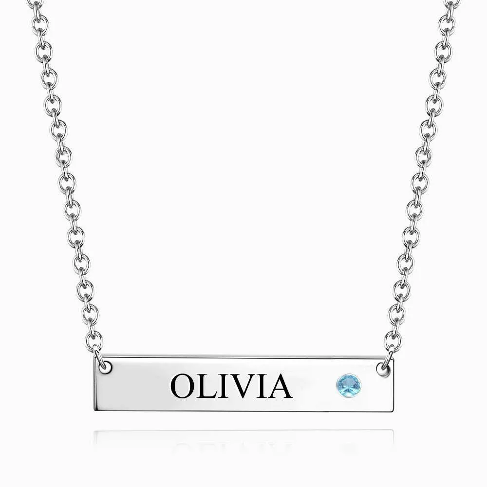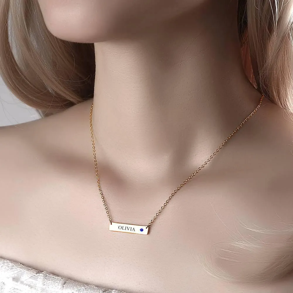 Elevate your style with our Personalized Birthstone Bar Necklace. This elegant necklace features a sleek bar pendant with the option for custom engraving and a choice of vibrant birthstone accents. The rose gold plating adds a touch of sophistication, while the durable base material ensures lasting quality.