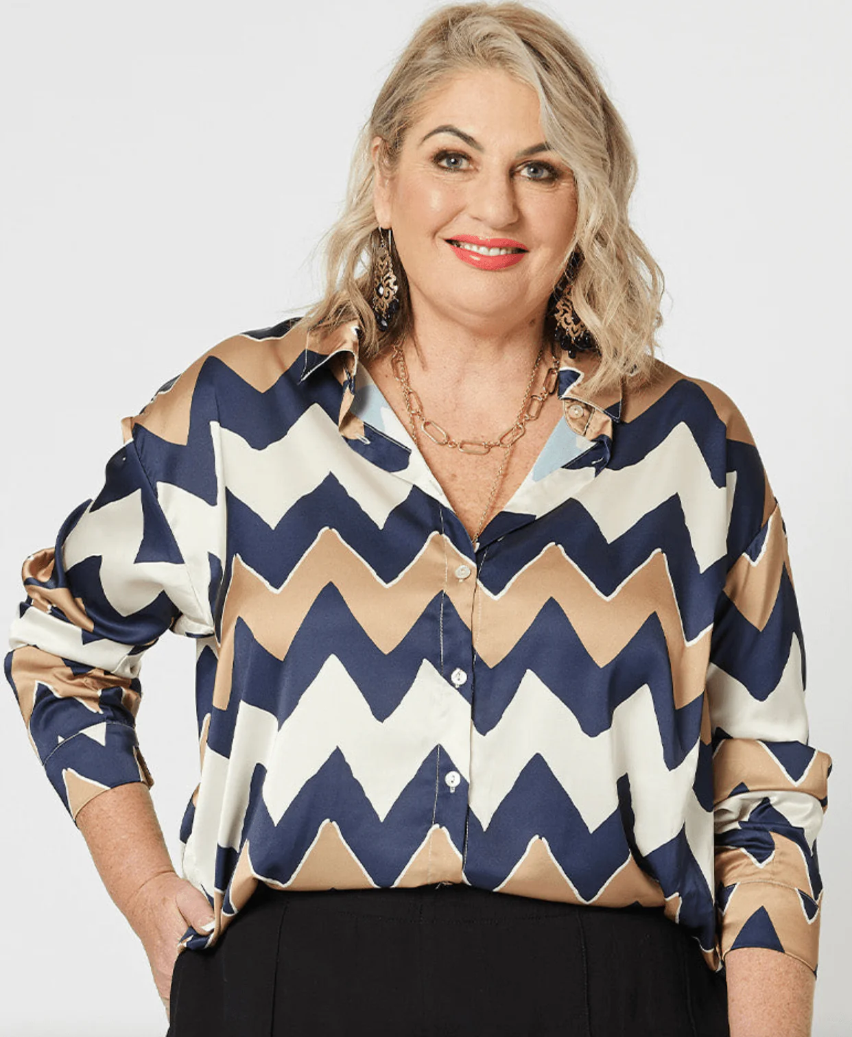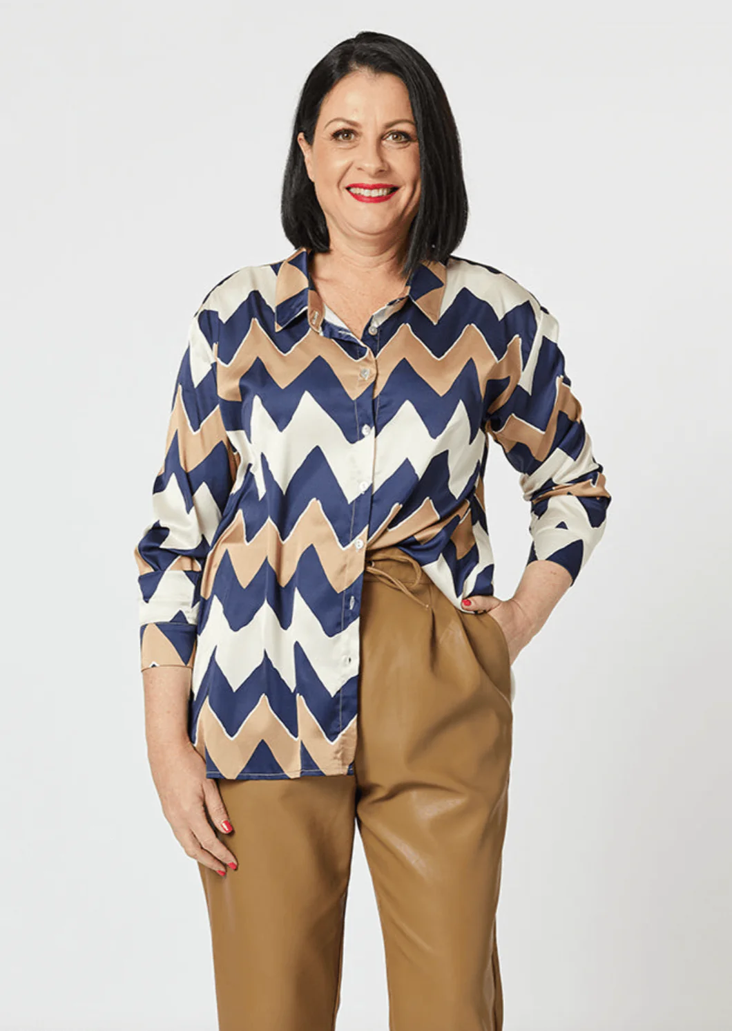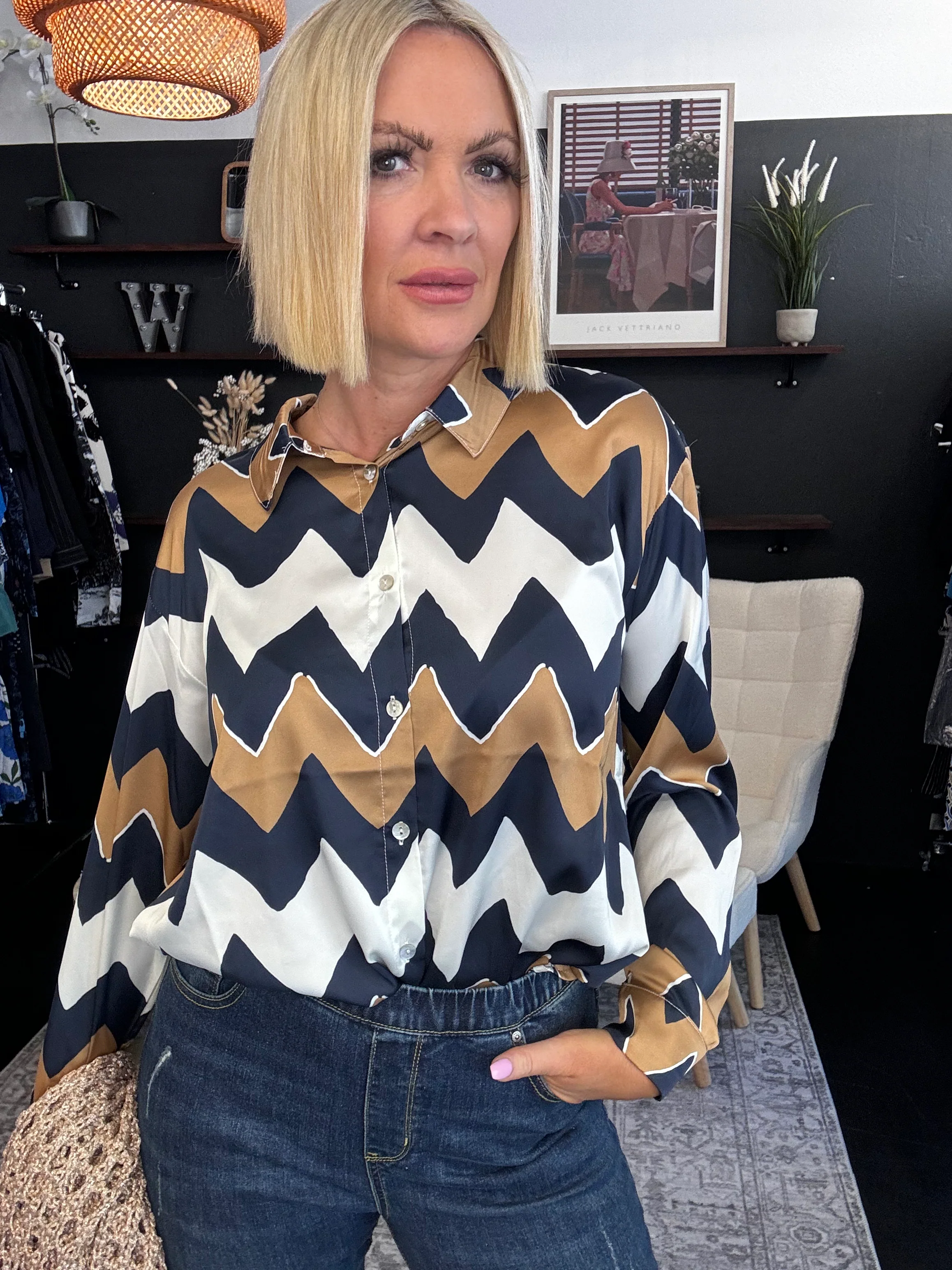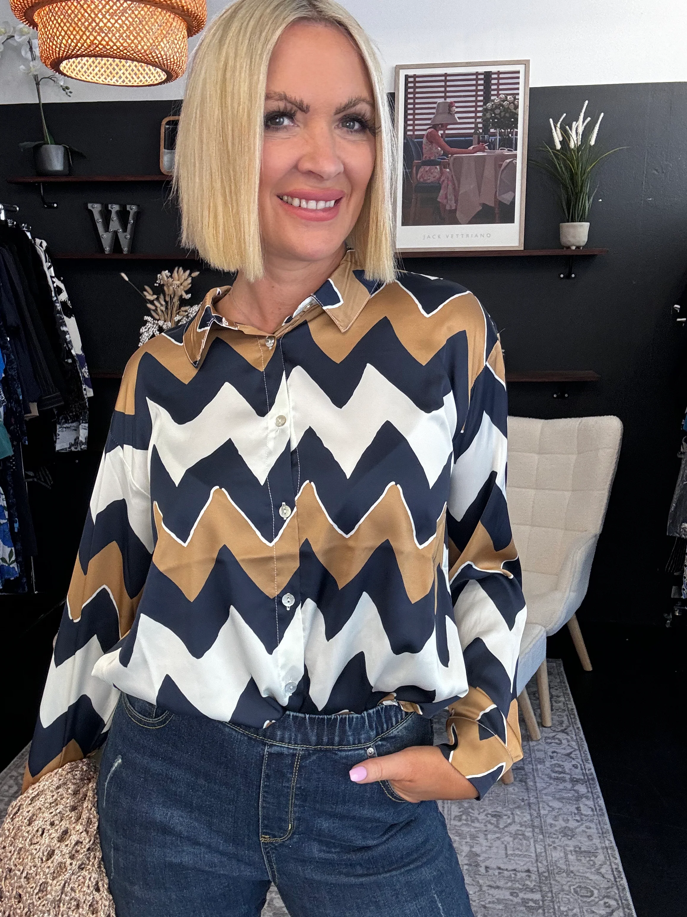 The bold chevron pattern features a mix of navy blue, cream, and beige tones, creating a modern and eye-catching design. The shirt's long sleeves and button-down front enhance its versatility, making it an ideal piece for layering or wearing solo.
