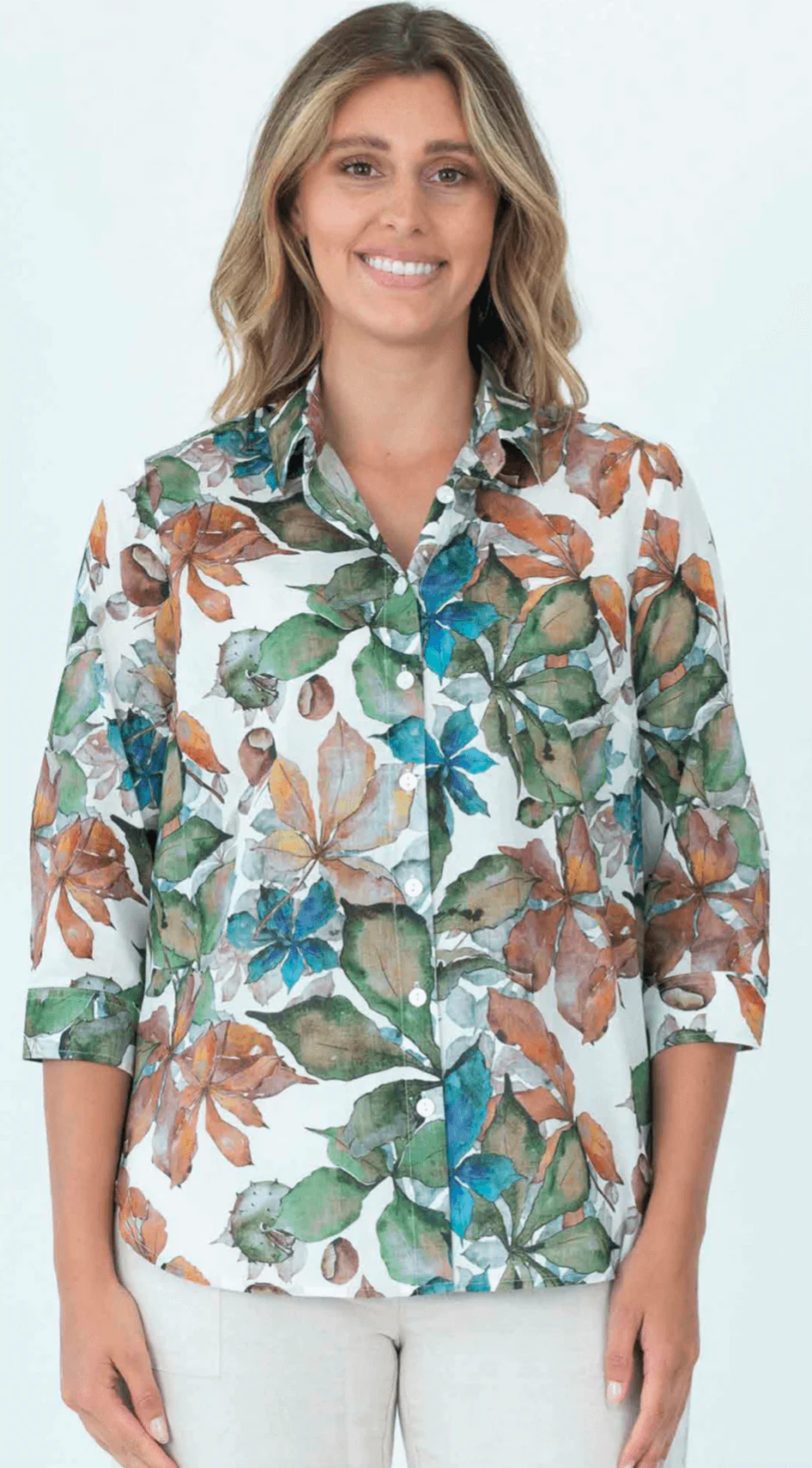 The tailored design includes a classic button-down front, three-quarter sleeves, and a structured collar, adding a timeless charm to its modern pattern. Pair it with neutral trousers or jeans to highlight the vibrant prints and achieve a balanced, elegant look.