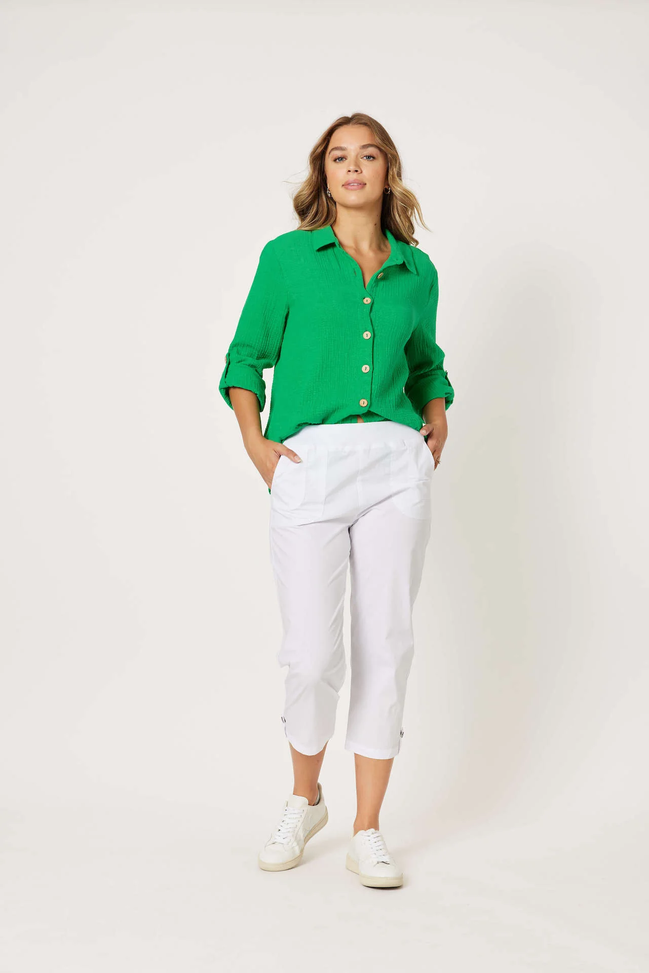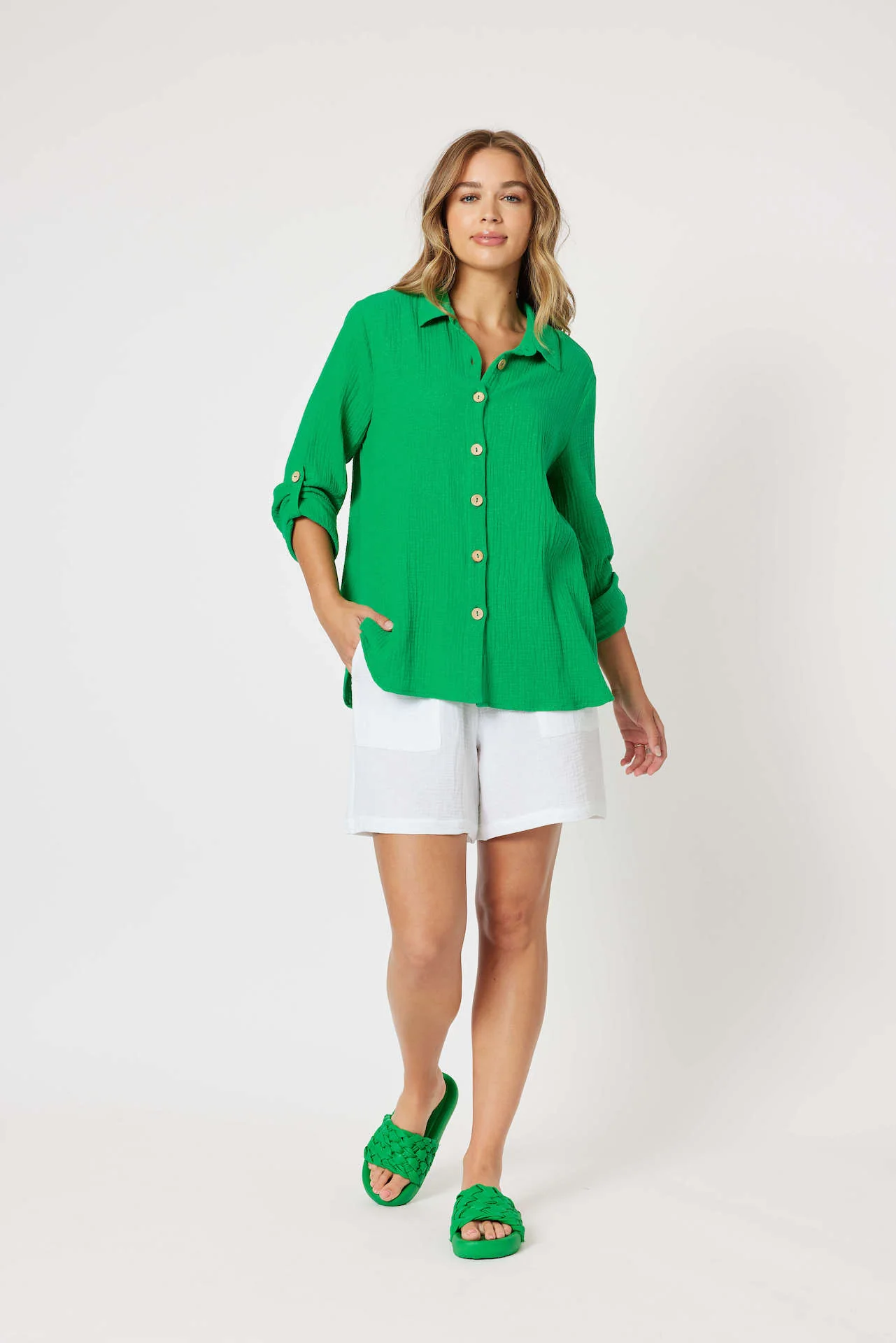 This women's button-up shirt is the perfect blend of comfort and style. Crafted from lightweight, breathable fabric, it ensures all-day ease while keeping you effortlessly chic. The vibrant green hue brings a fresh, lively touch to your wardrobe, making it ideal for casual outings or laid-back weekends.