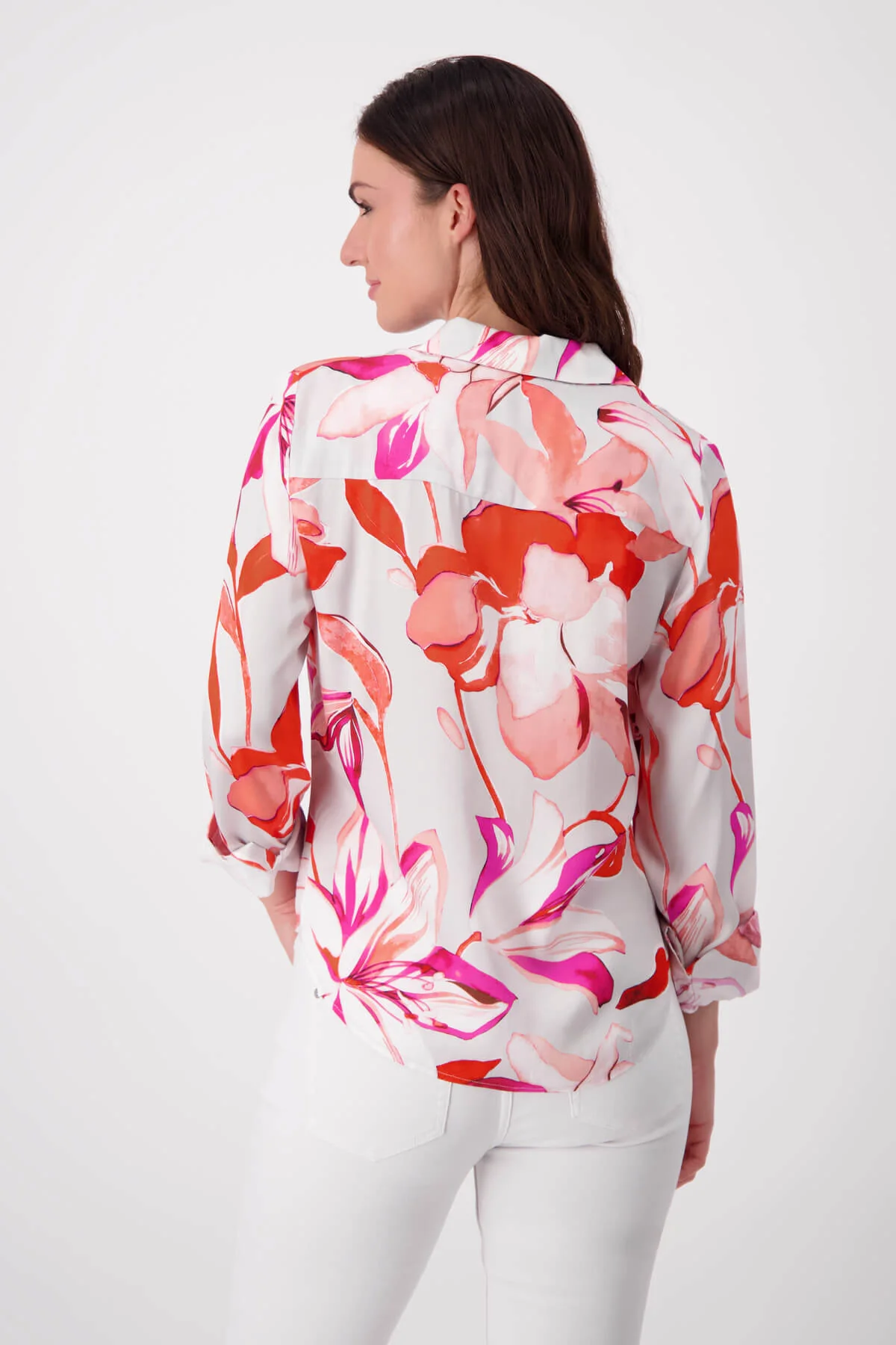 Its relaxed fit, classic button-up front, and rolled-up sleeves provide versatility and effortless charm. Pair it with white jeans for a fresh, chic look or style it with tailored pants for a more polished finish.