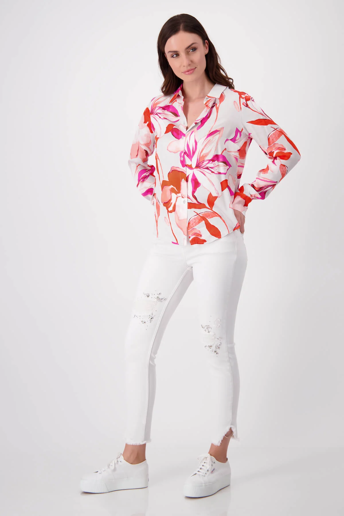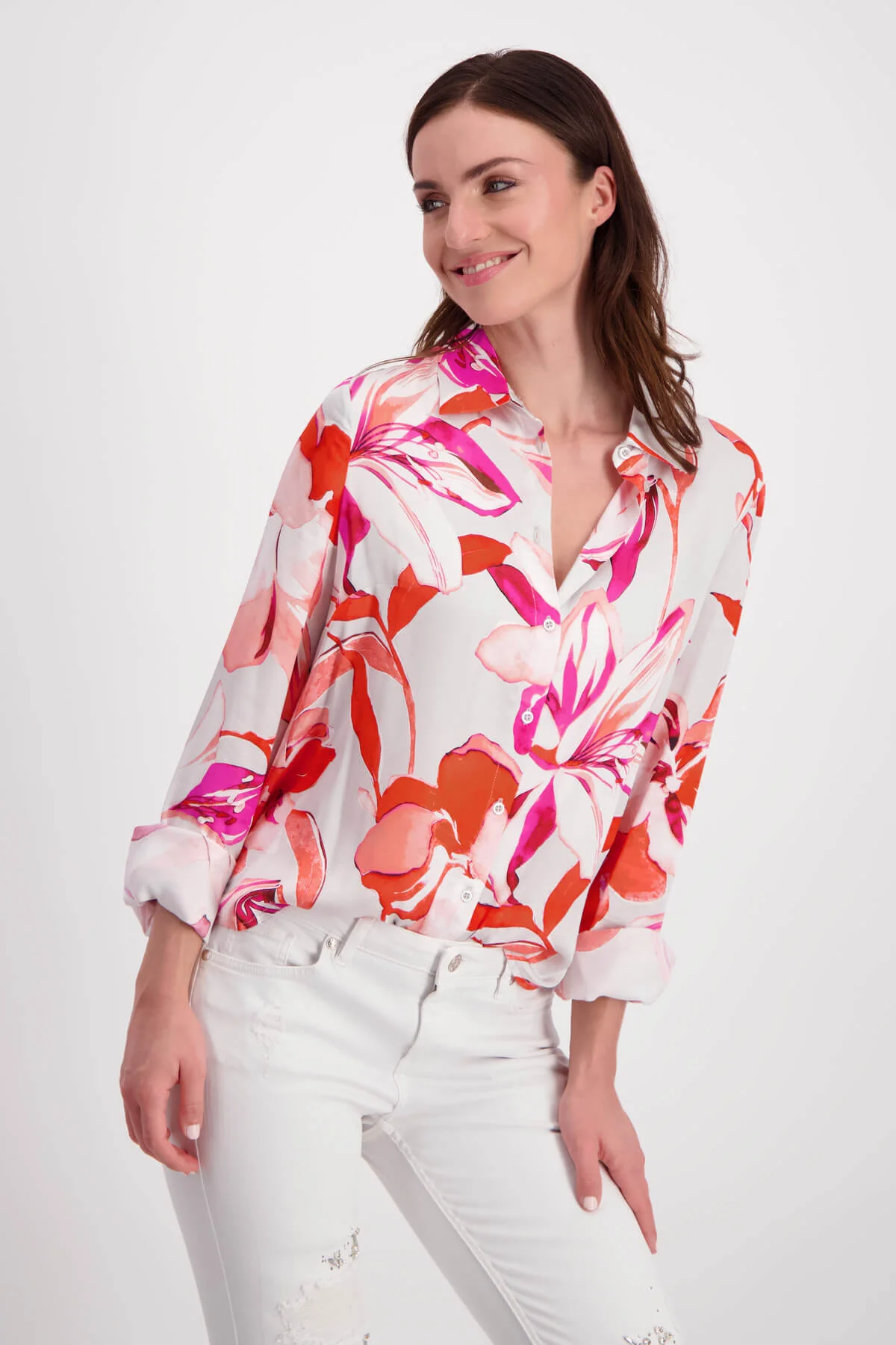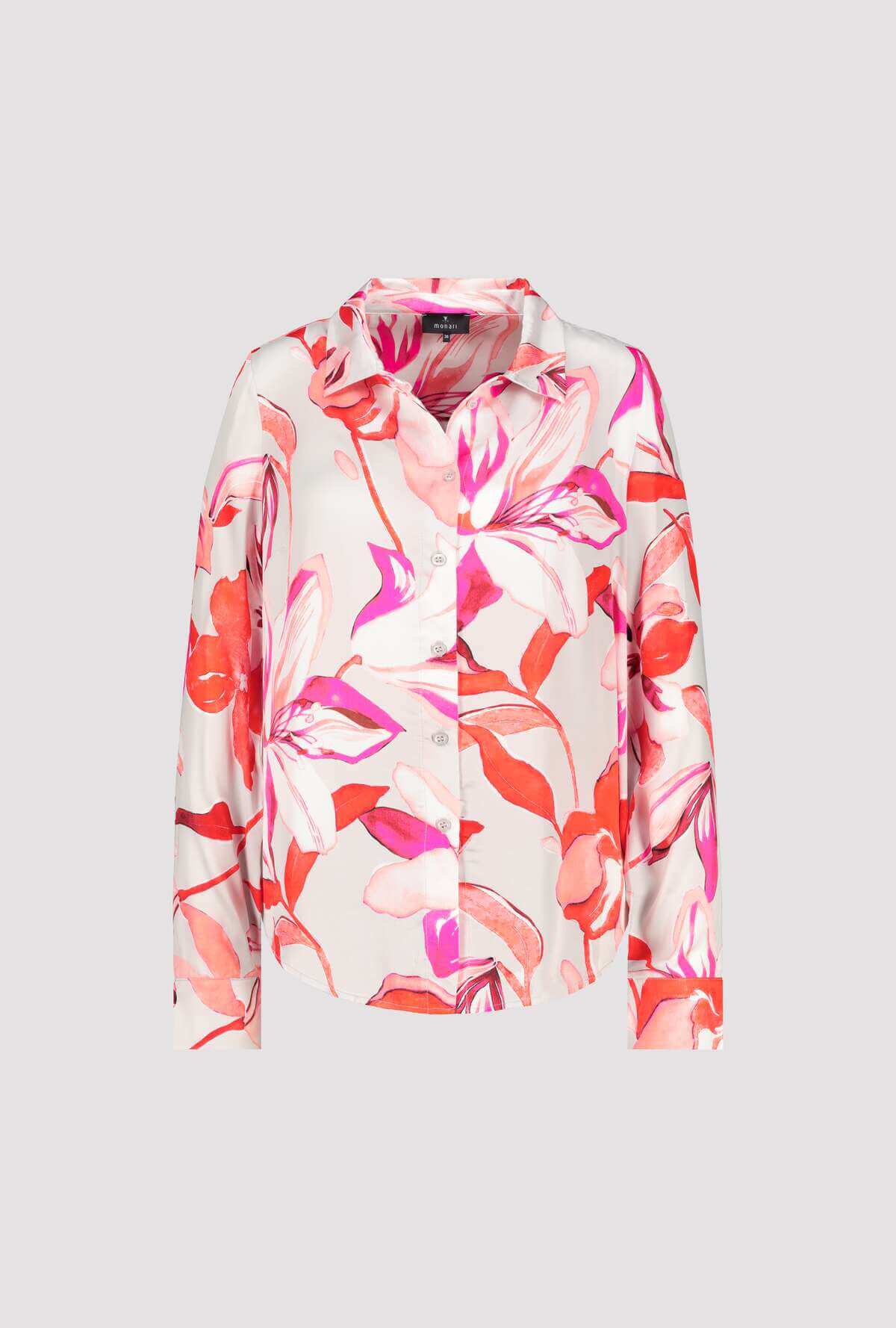 This stunning long-sleeve shirt features a lively and artistic floral print in bold shades of red, pink, and coral. Designed to add a touch of elegance and vibrancy to any wardrobe, it captures the essence of modern sophistication and style.