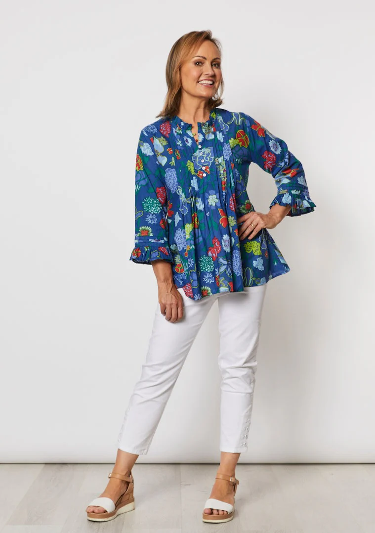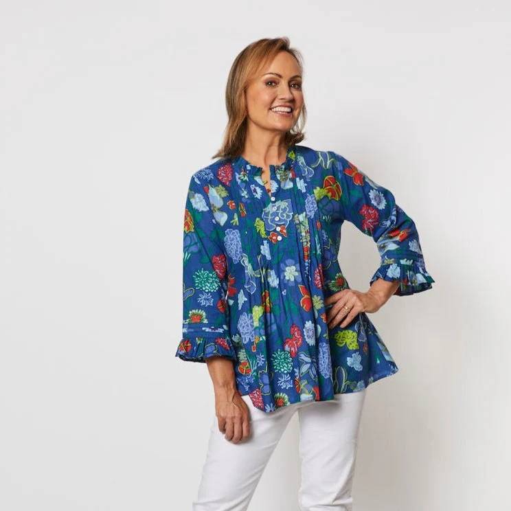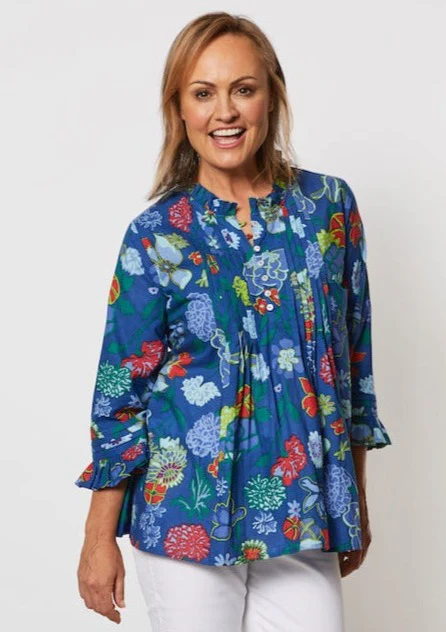 The blouse features a striking floral print on a rich blue base, offering an elegant yet playful design. The variety of colors, including red, green, and soft pastel shades, adds versatility, making it easy to pair with neutral or bright accessories. The intricate floral patterns add a fresh, nature-inspired touch to your wardrobe.