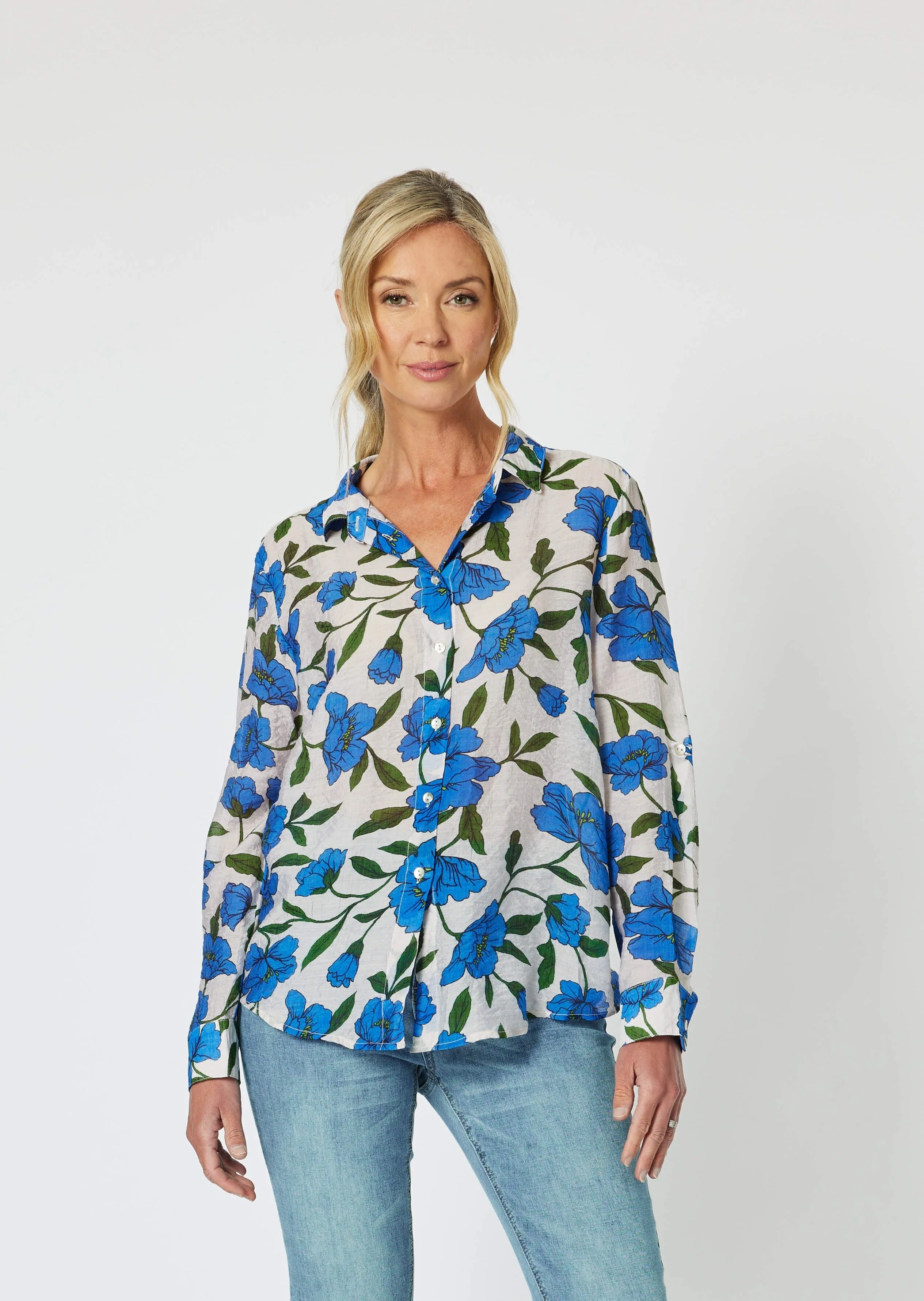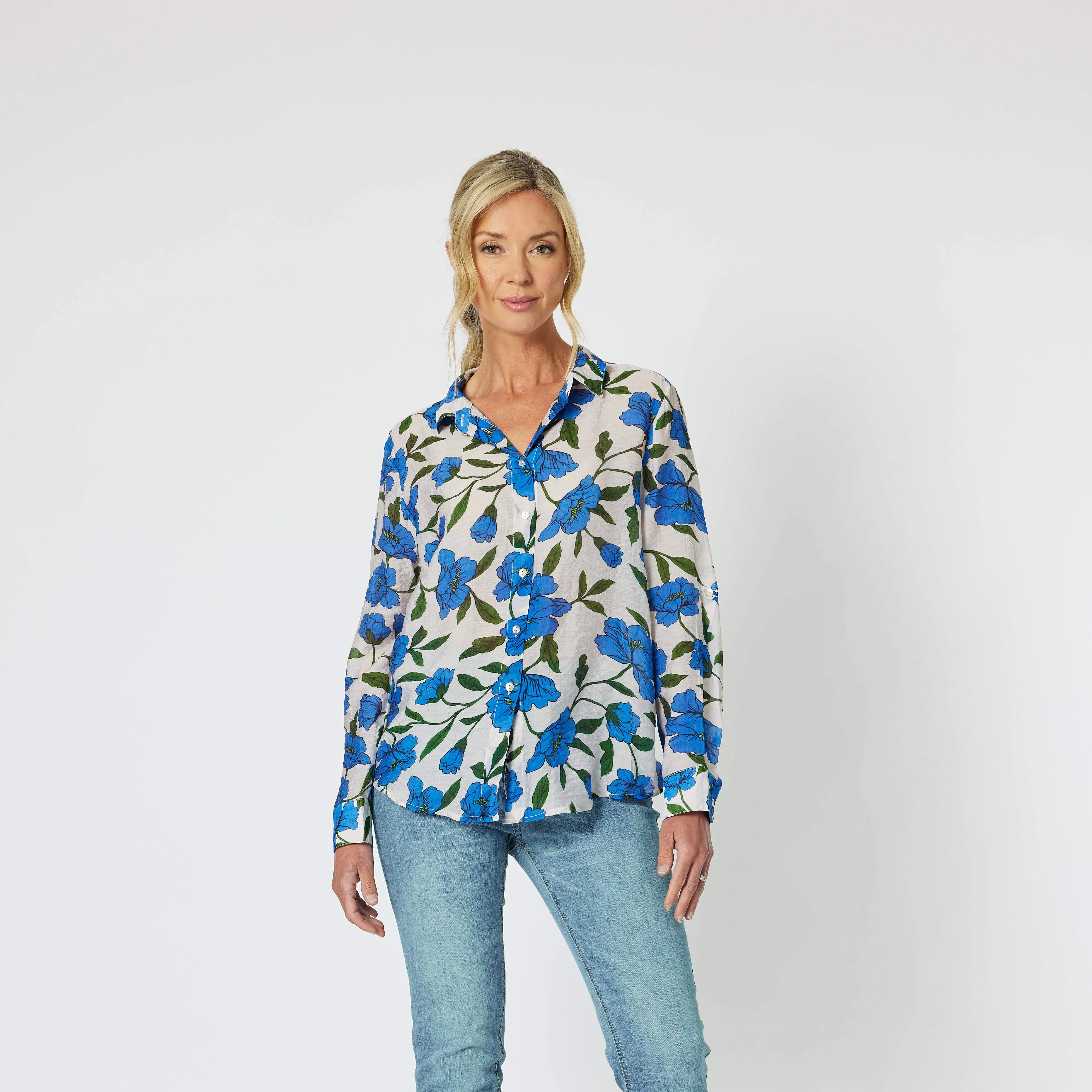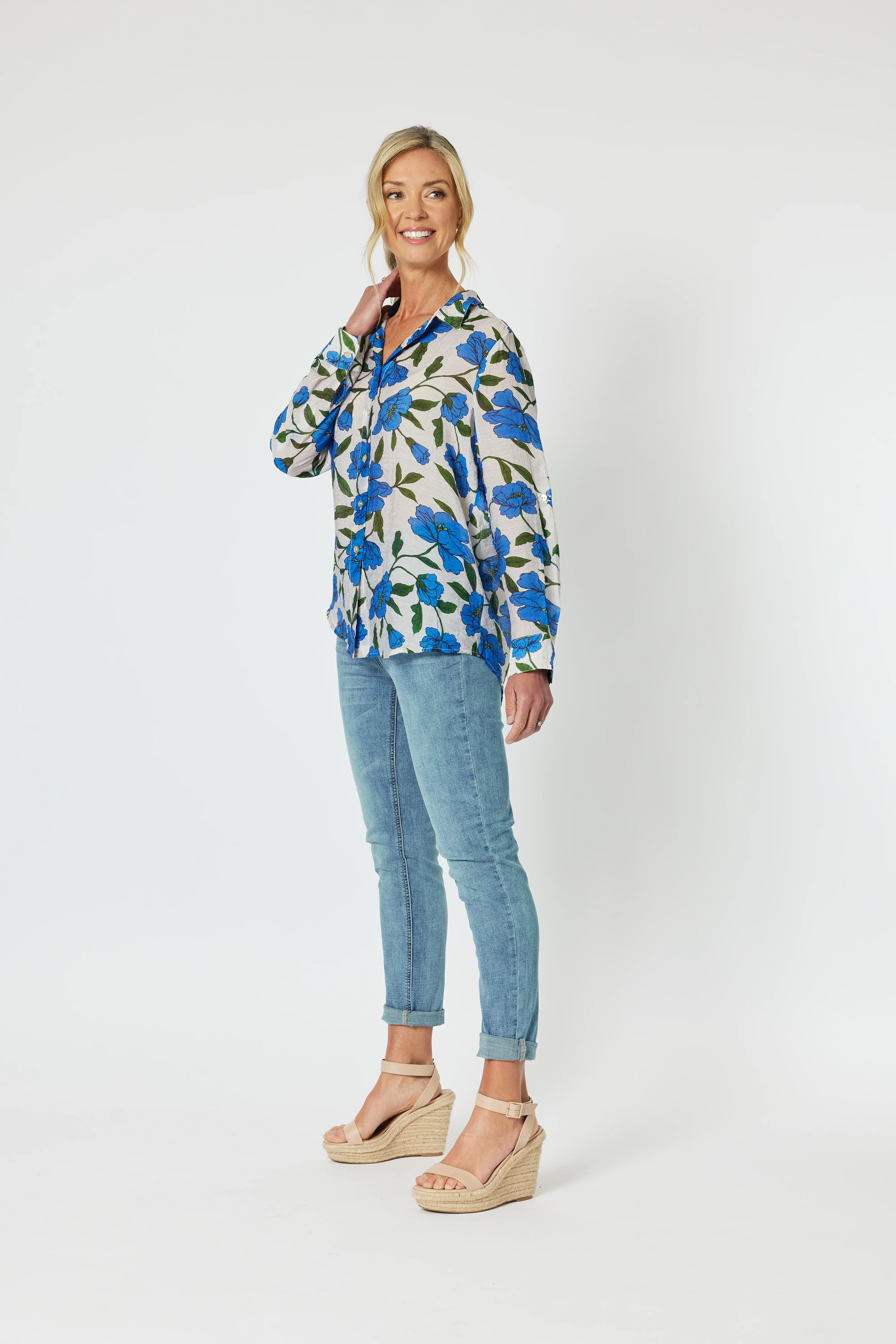 The shirt showcases a vibrant blue floral pattern against a soft, neutral background, perfect for adding a pop of color to any wardrobe. Its long sleeves and classic button-front closure make it versatile for all seasons.