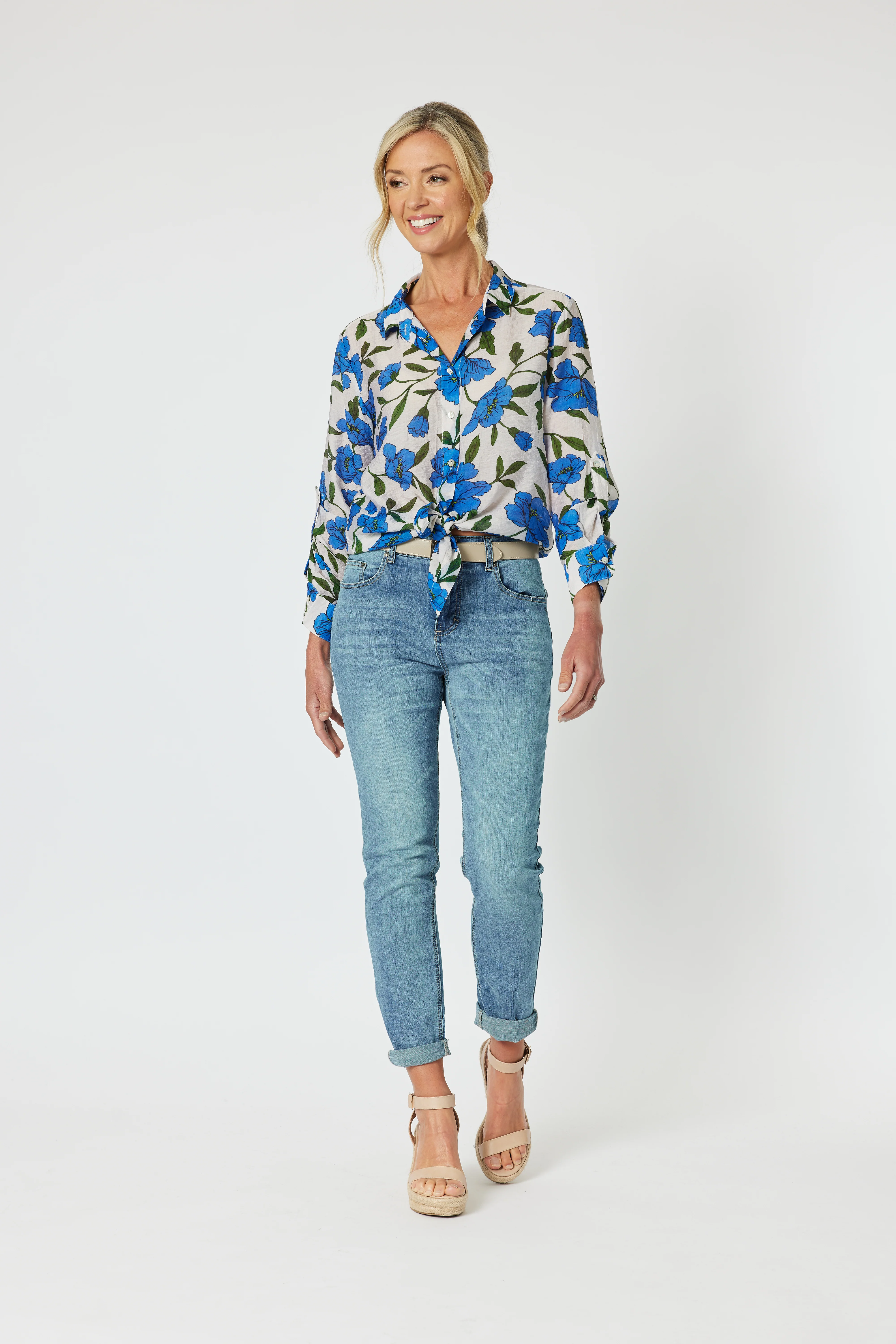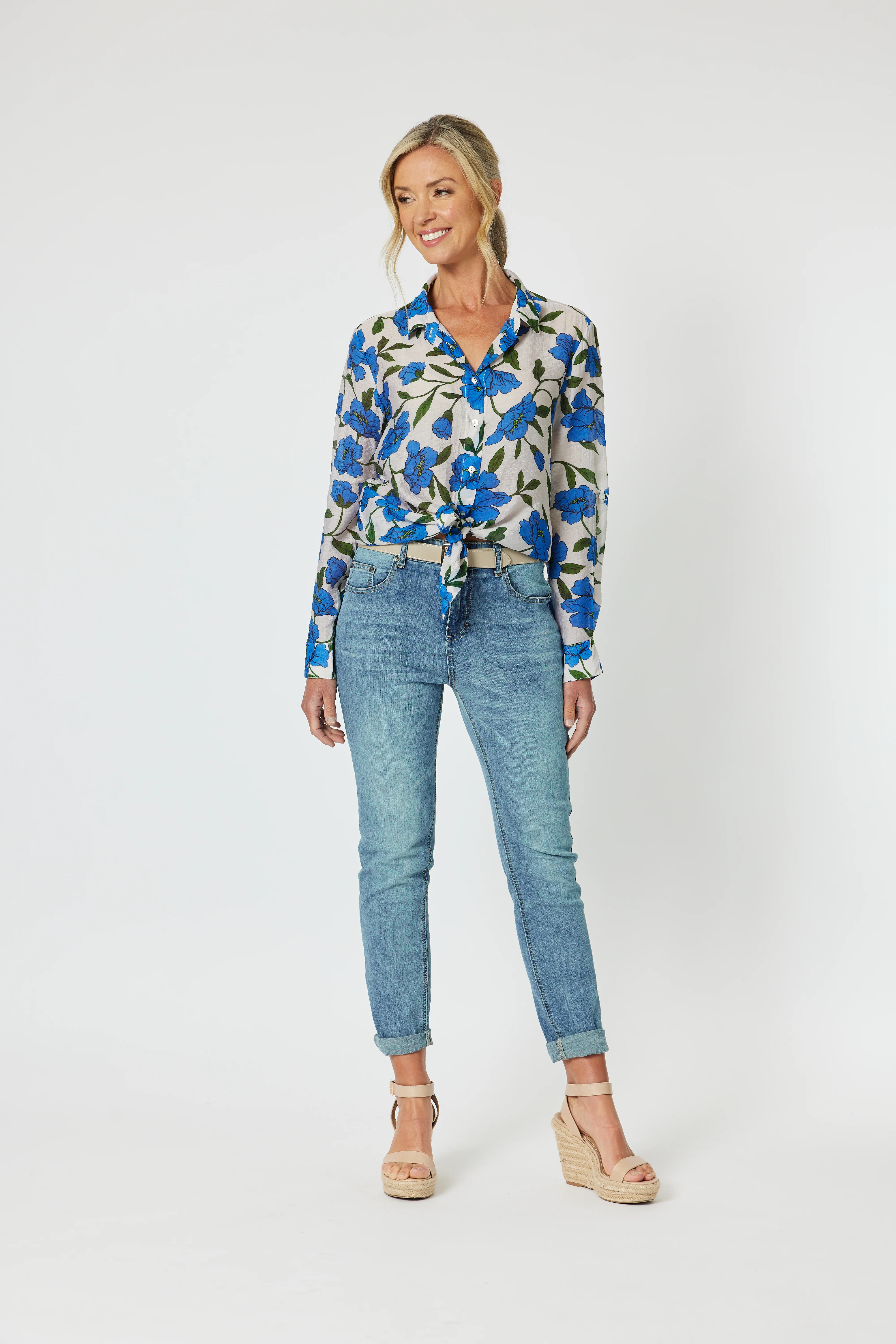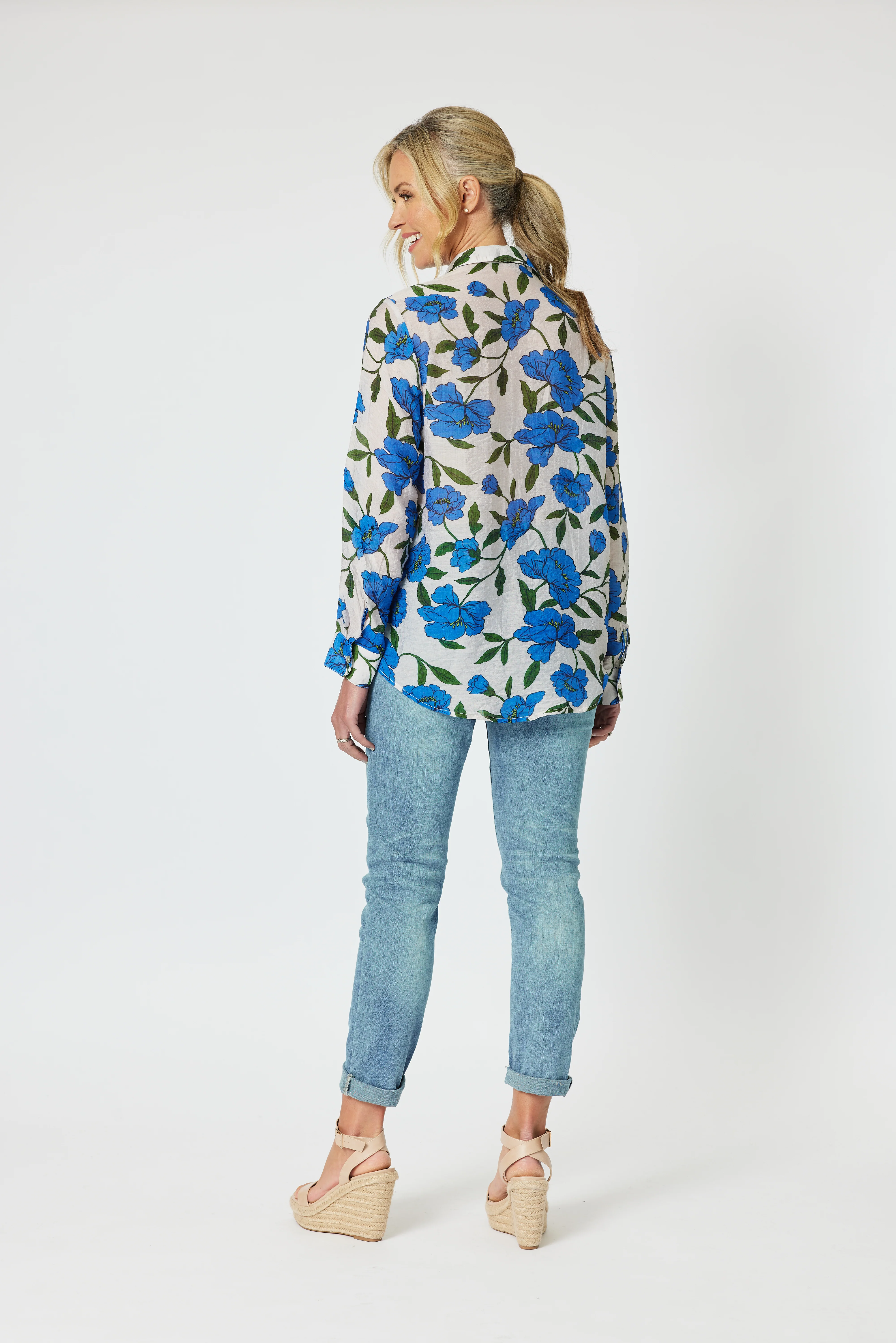 The shirt showcases a vibrant blue floral pattern against a soft, neutral background, perfect for adding a pop of color to any wardrobe. Its long sleeves and classic button-front closure make it versatile for all seasons.
