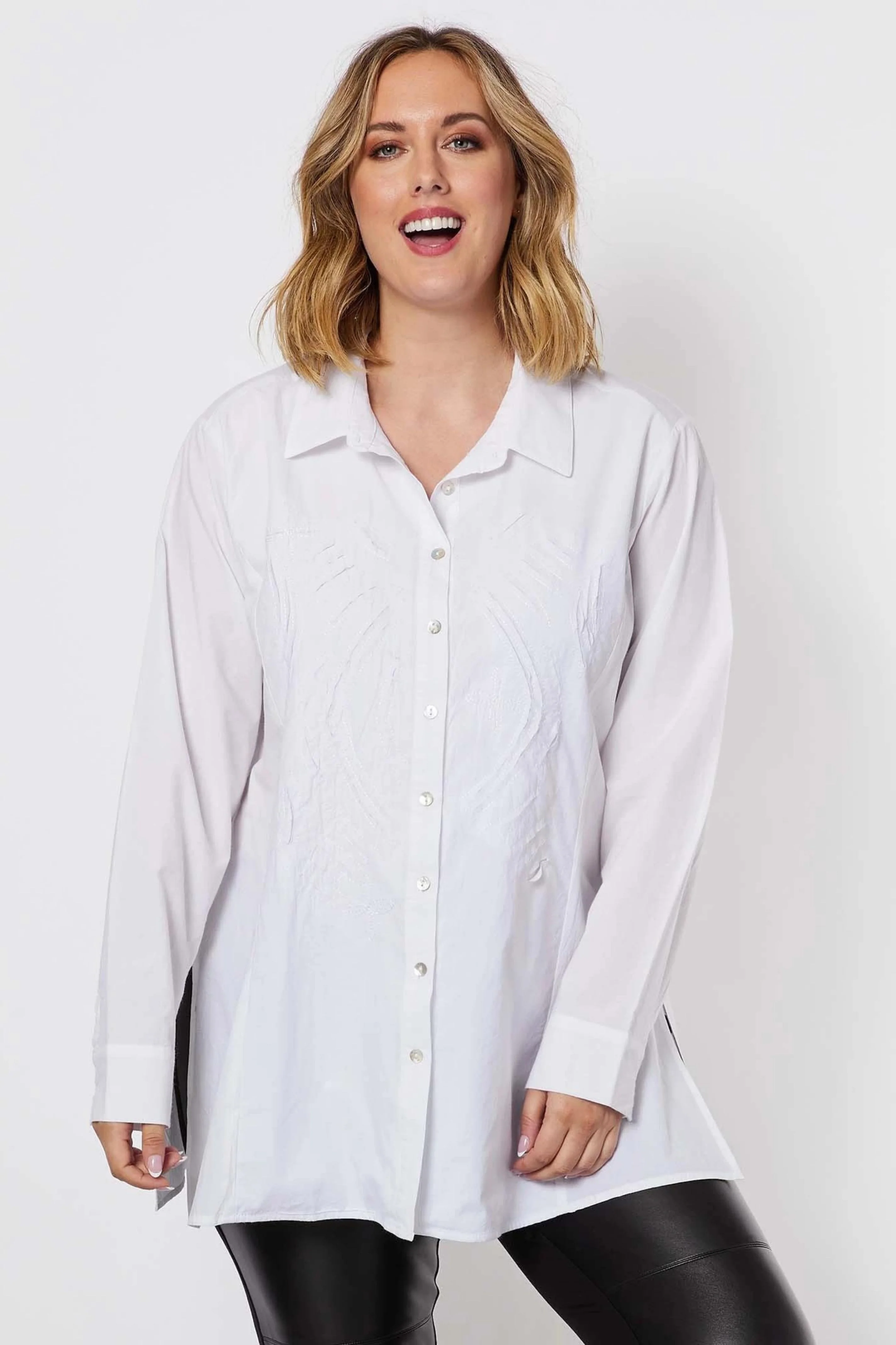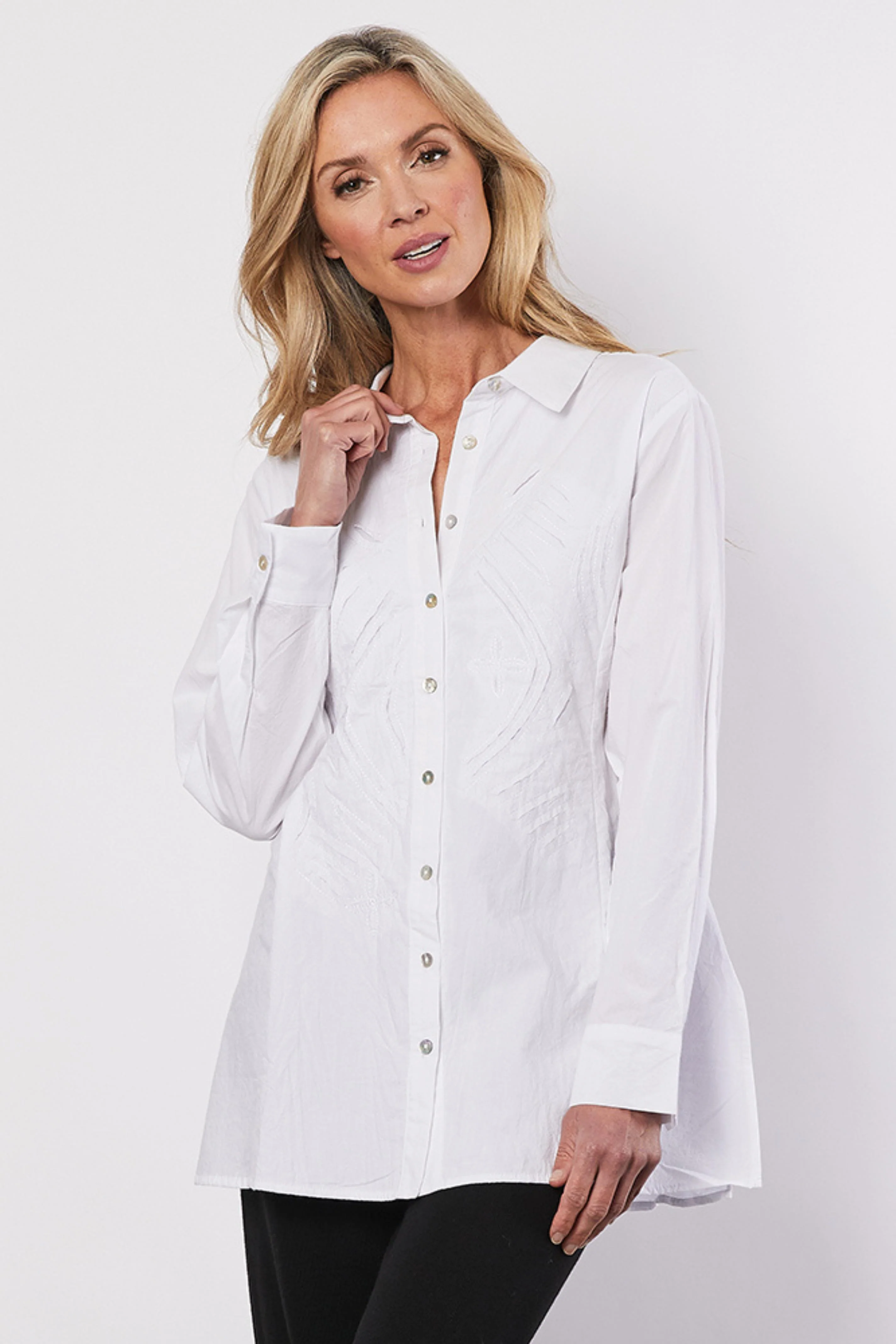 Adding a touch of sophistication, the shirt boasts intricate stitched detailing on the front, creating subtle texture and visual interest. The slightly flared hemline adds a modern twist to this classic wardrobe staple, making it perfect to pair with jeans, leggings, or dress pants.
