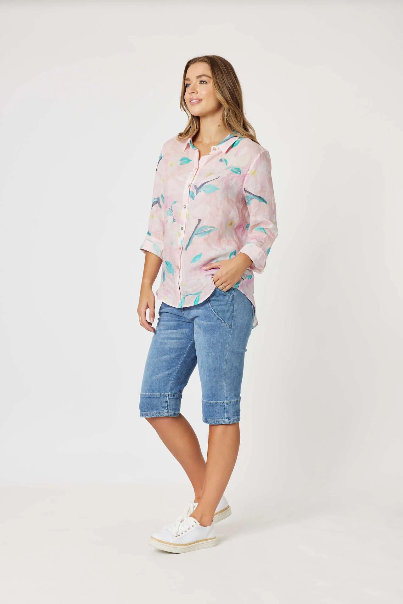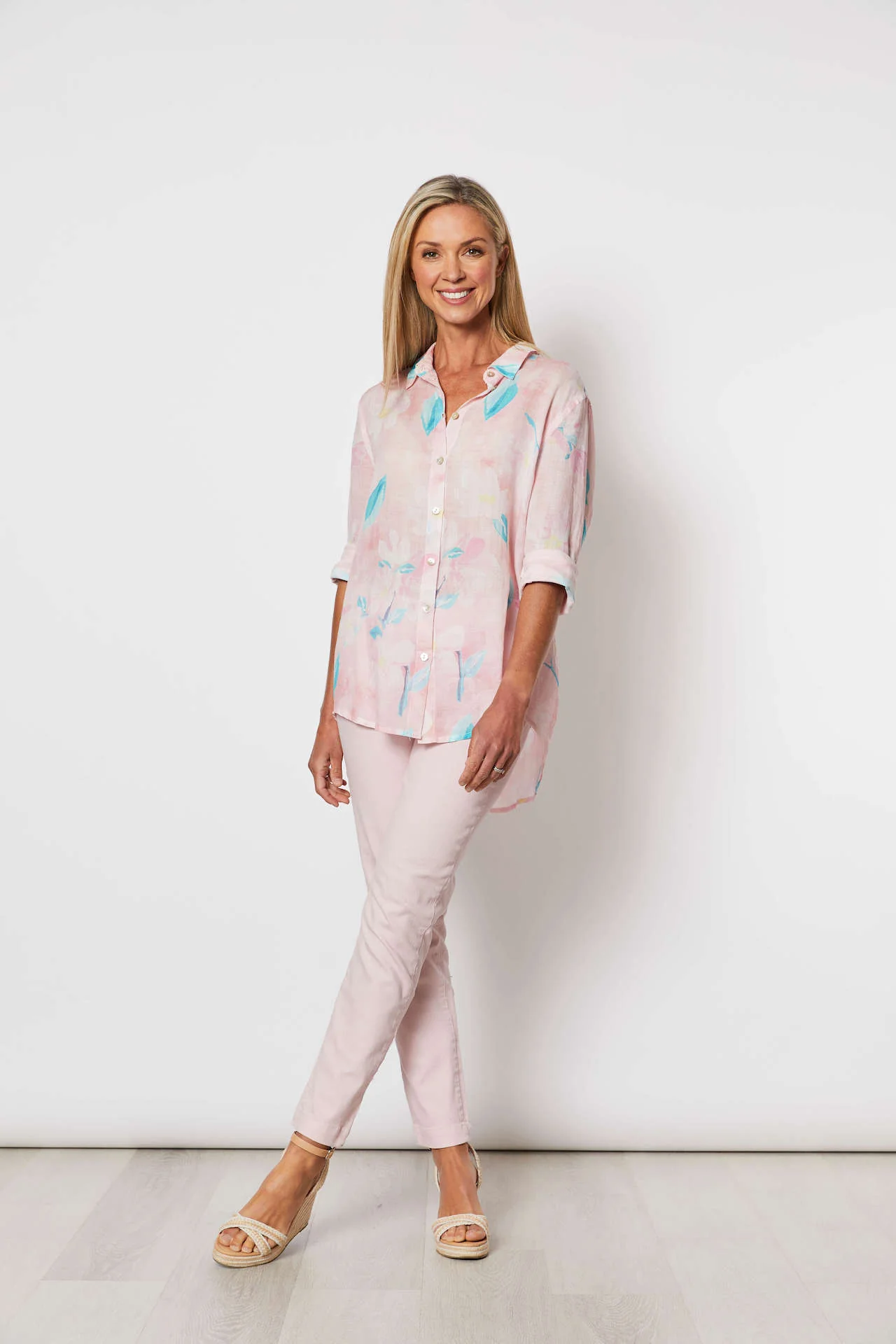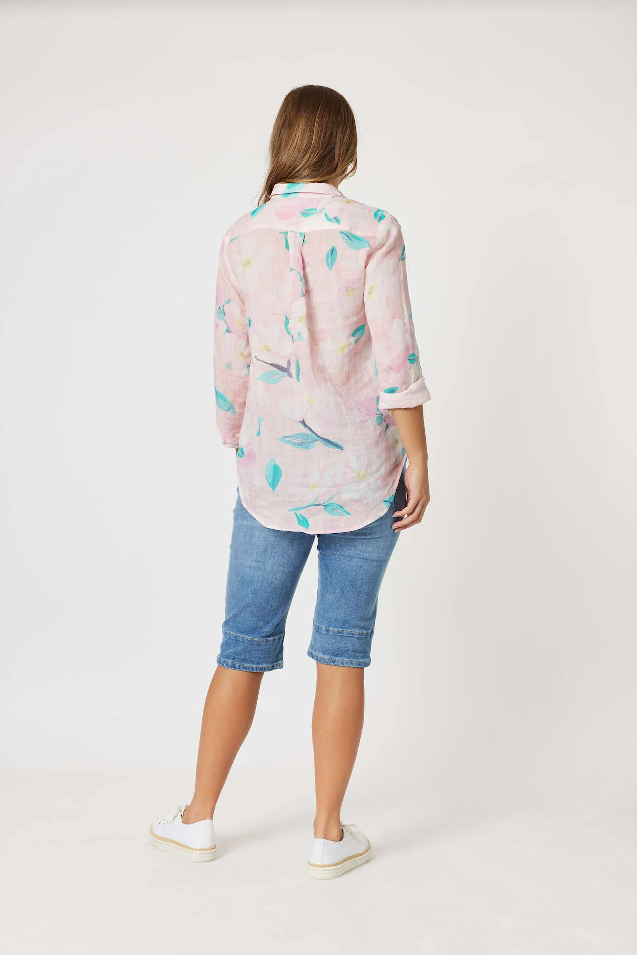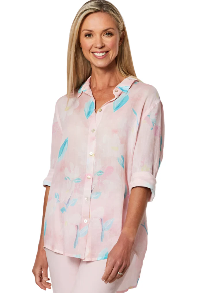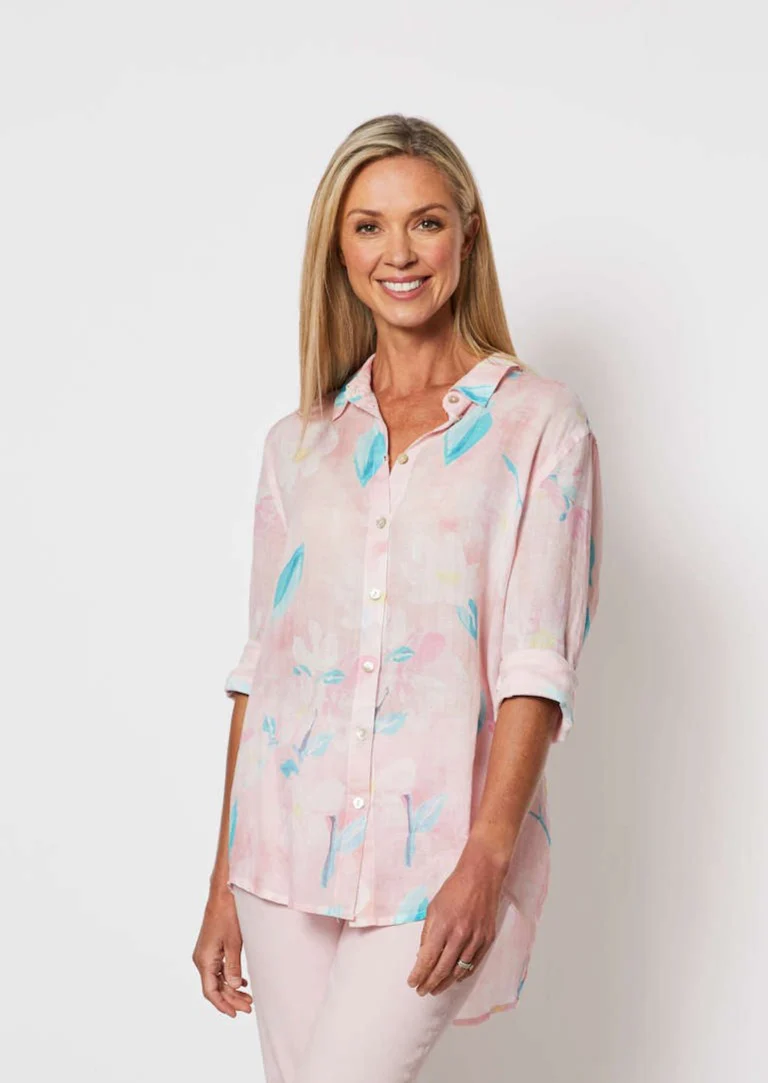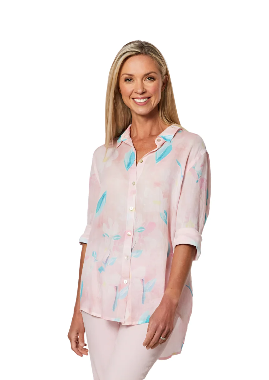 This beautifully designed pastel shirt is made from premium quality linen, offering a lightweight and breathable experience for any season. The soft pink hue is adorned with subtle watercolor-inspired floral prints in shades of blue and white, creating an elegant and fresh aesthetic.