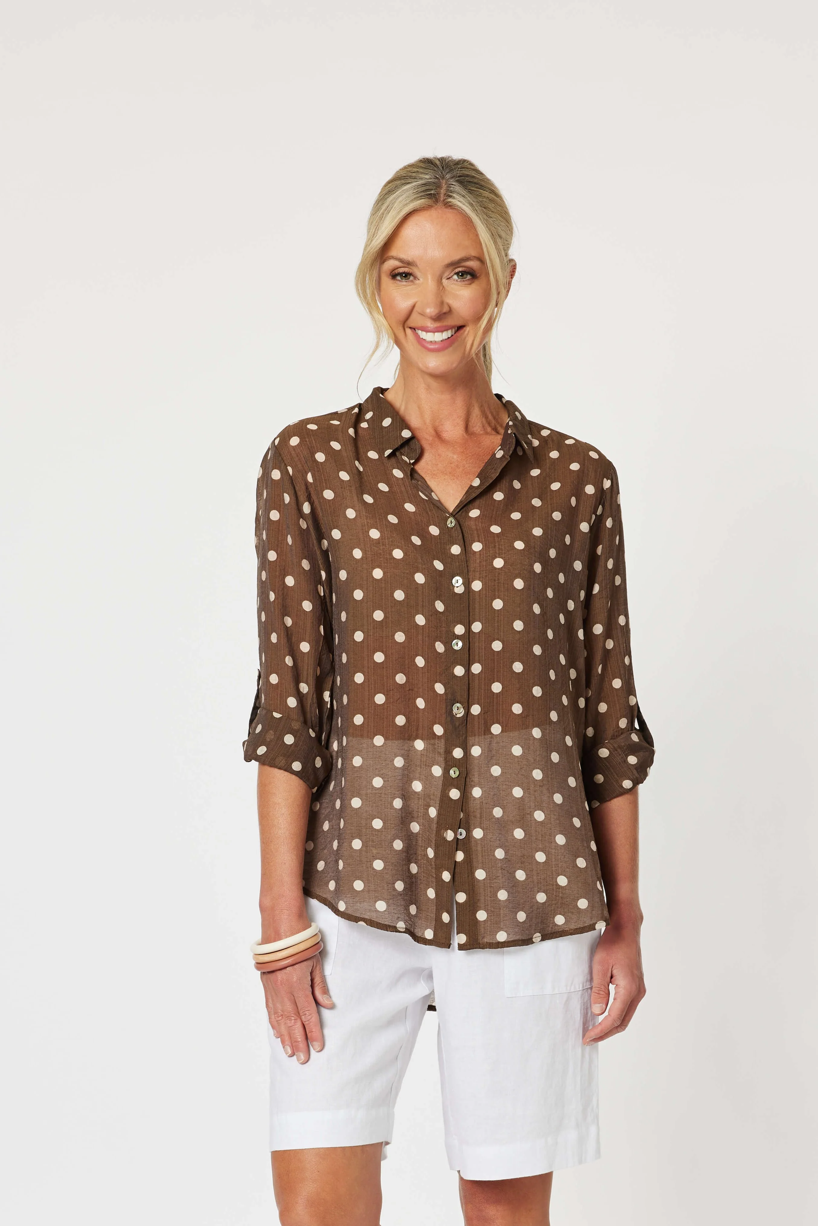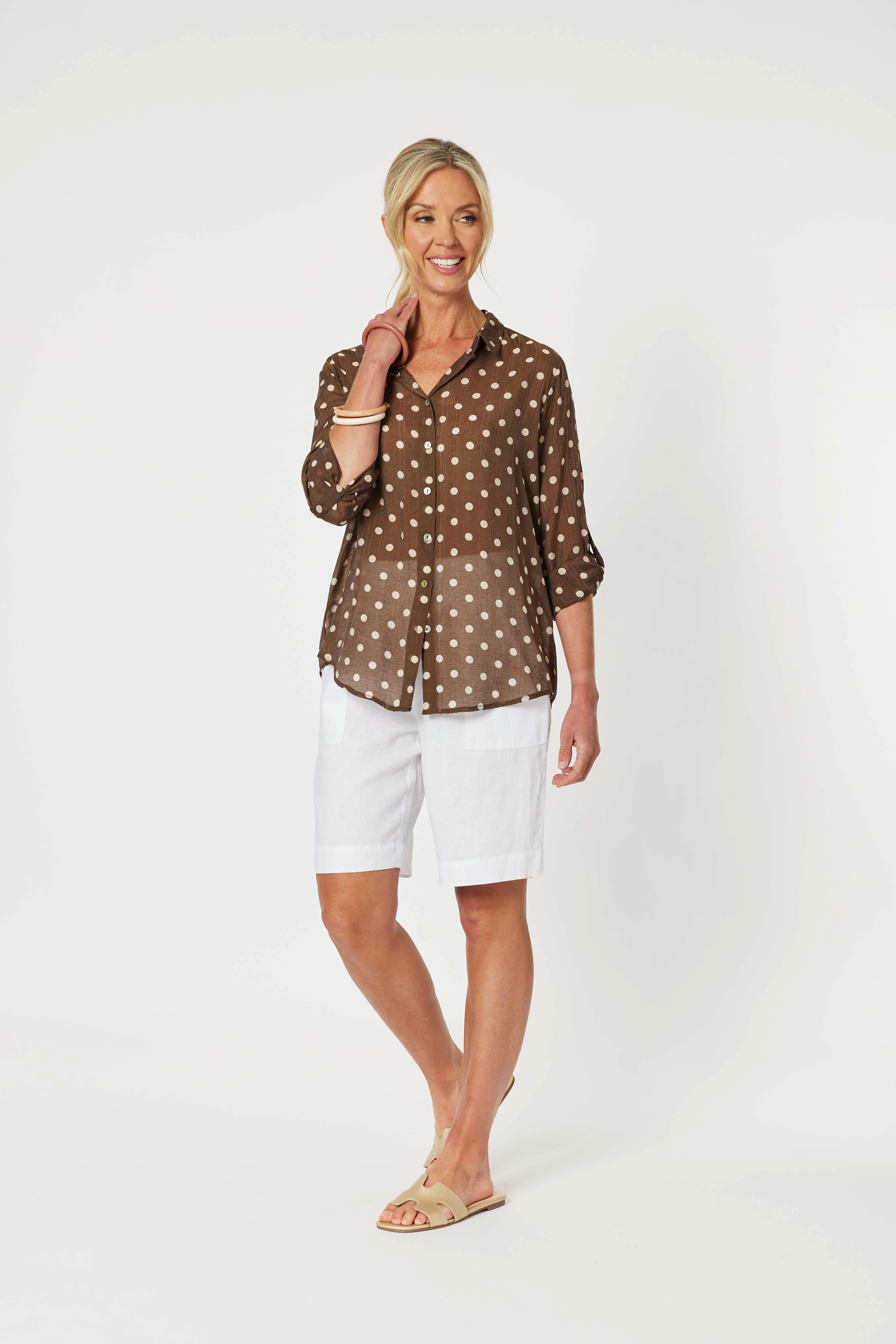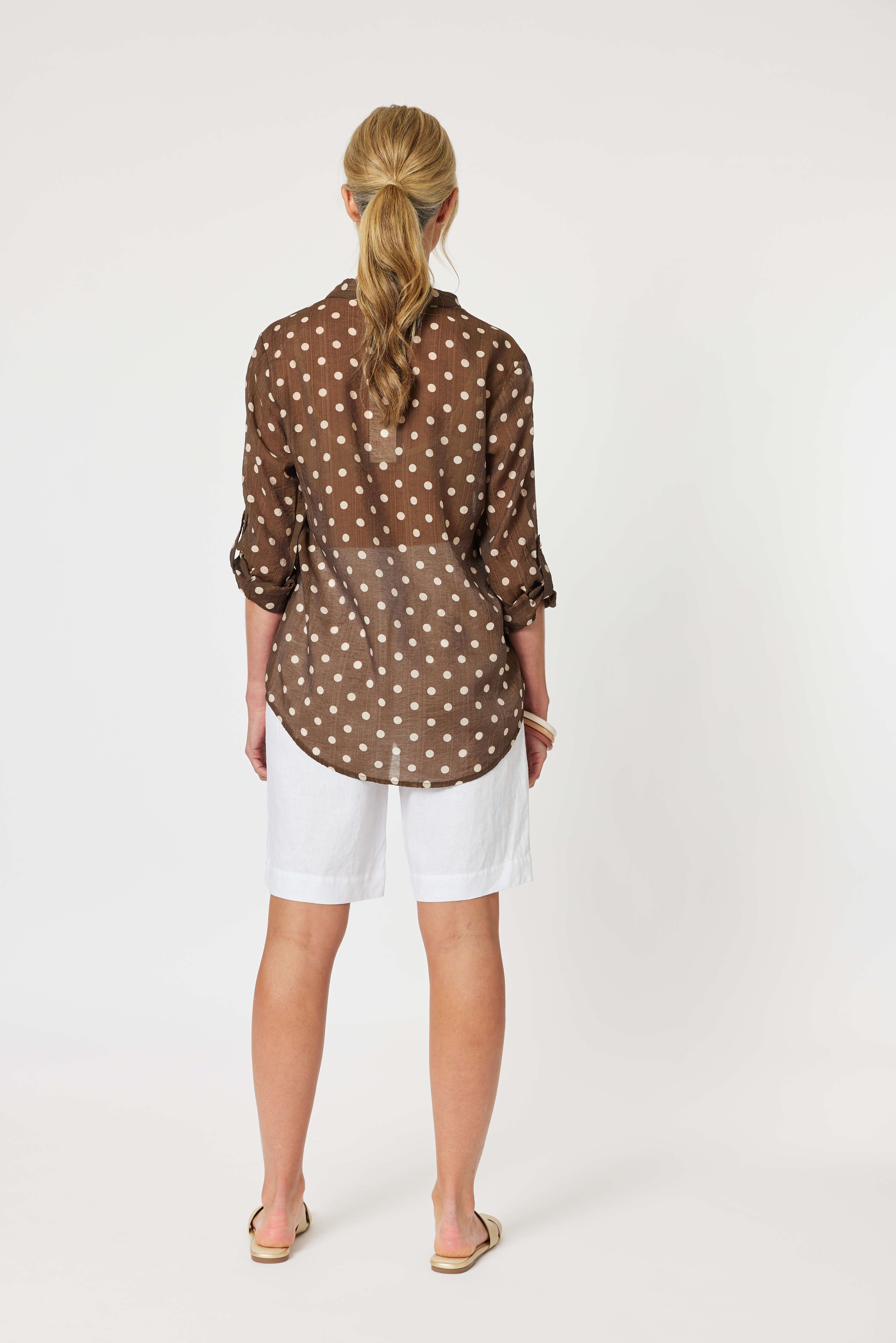Designed in a rich brown hue with delicate white polka dots, this timeless pattern brings a playful yet elegant vibe. Pair it effortlessly with white shorts, jeans, or tailored trousers for a polished outfit that never goes out of style.