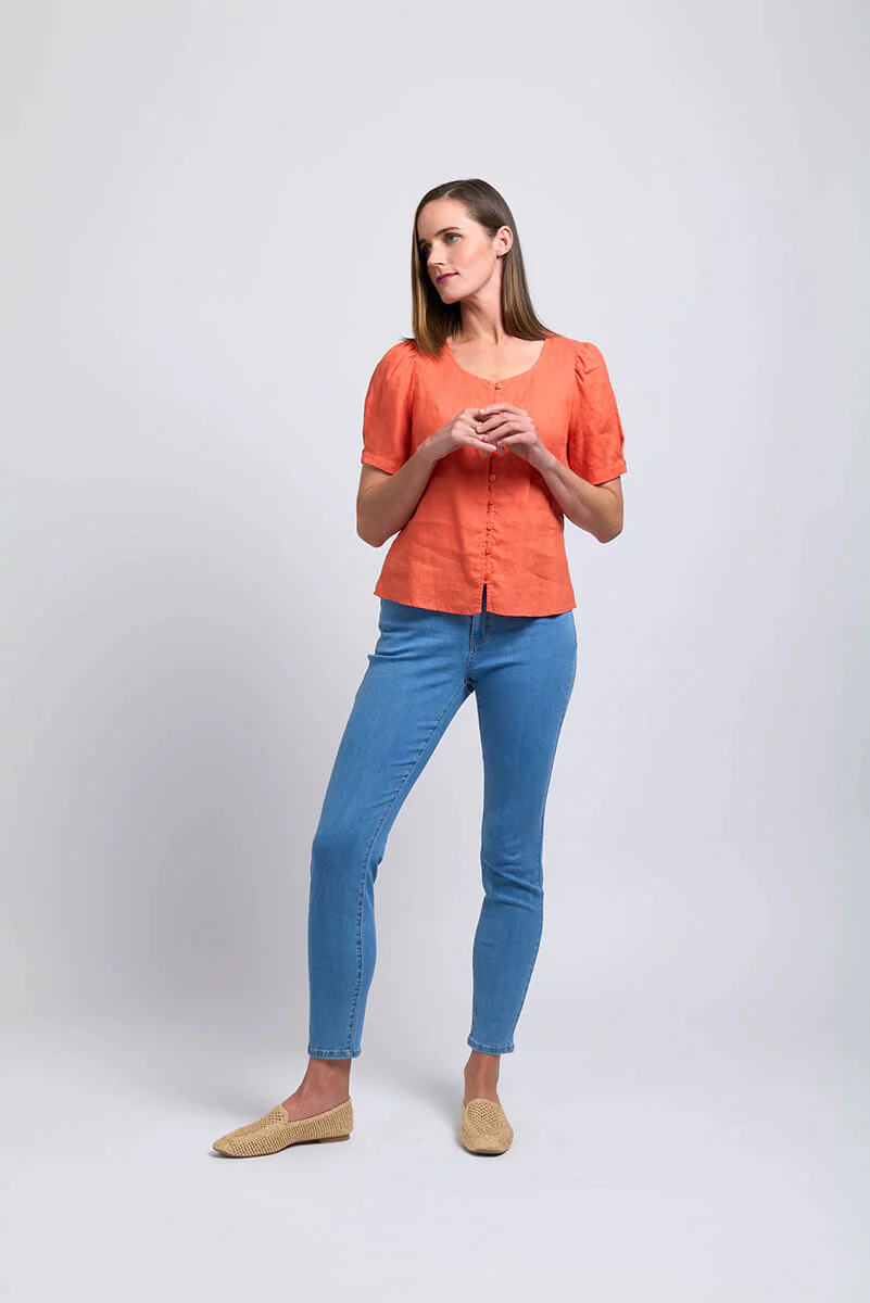 Designed with a flattering scoop neckline and delicate button-up front, this blouse effortlessly combines a touch of vintage charm with modern simplicity. The subtle puff sleeves add a soft, feminine silhouette, enhancing the overall elegant look.
