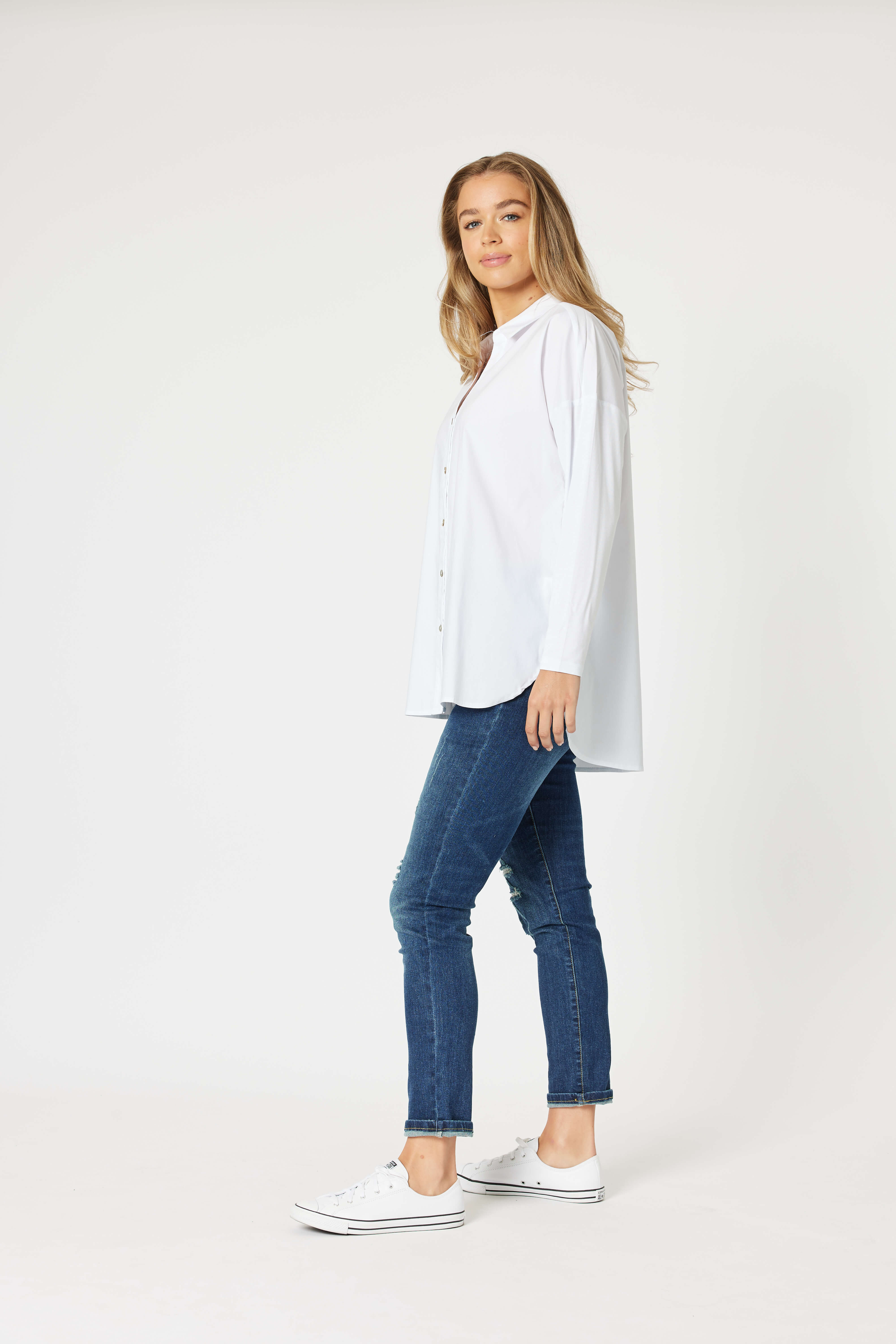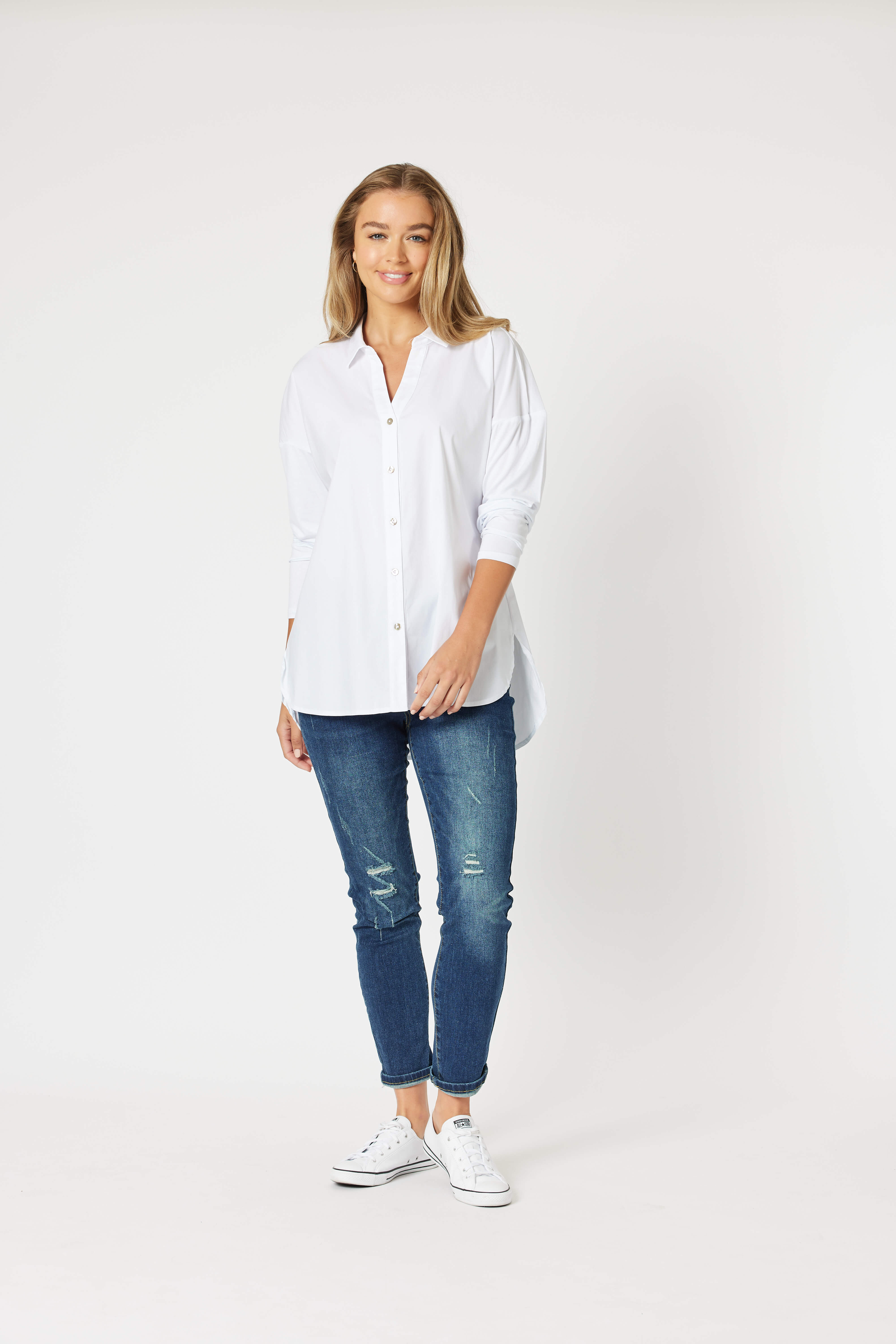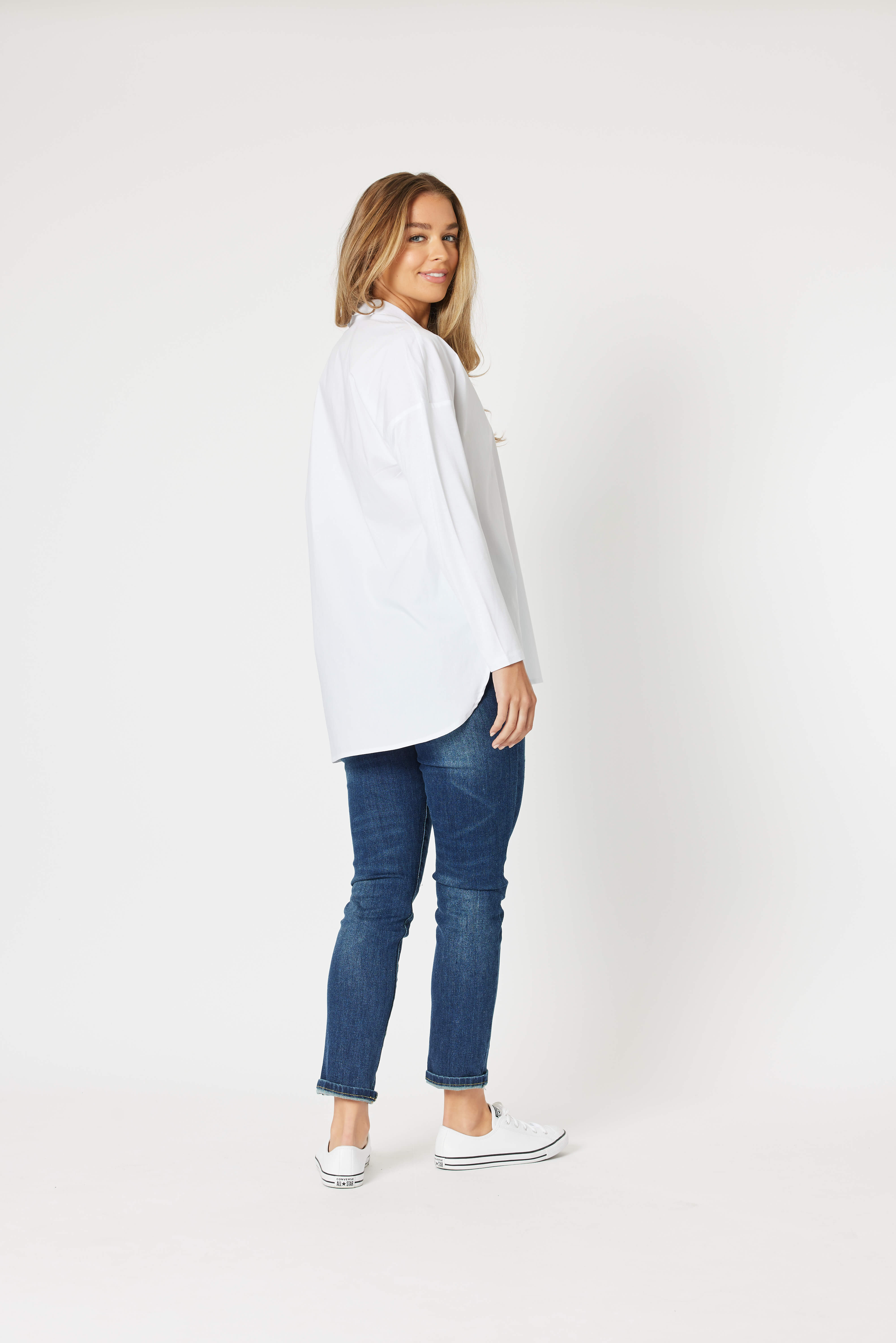 The design includes a flattering relaxed fit, a classic pointed collar, and a button-front closure with pearlescent buttons for a subtle touch of elegance. The long sleeves can be worn as is or rolled up for a more relaxed and contemporary vibe.