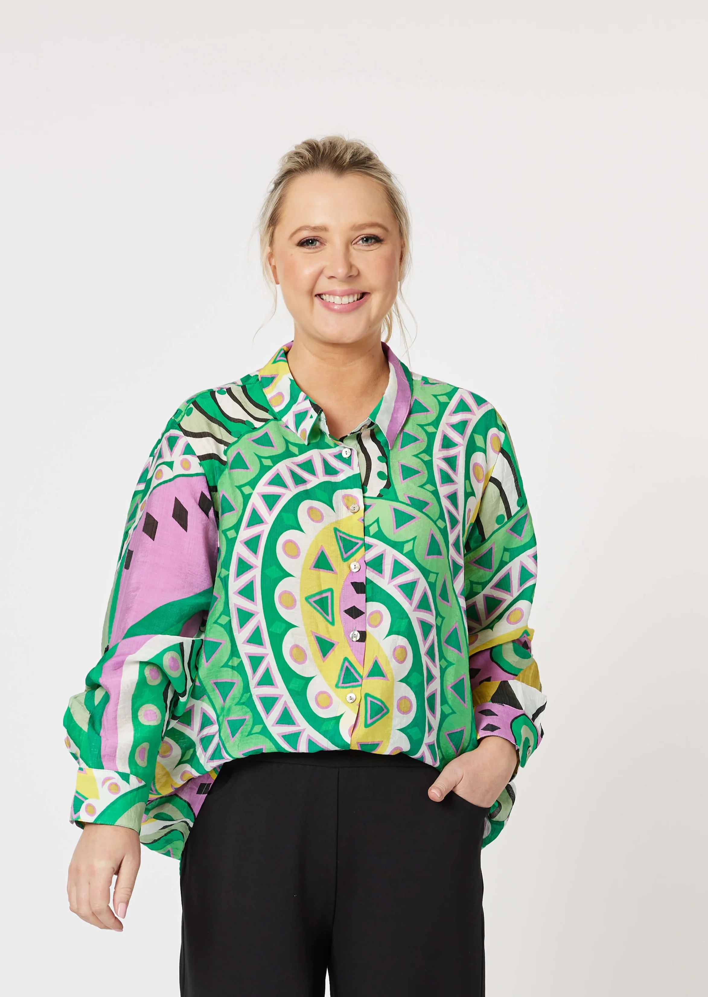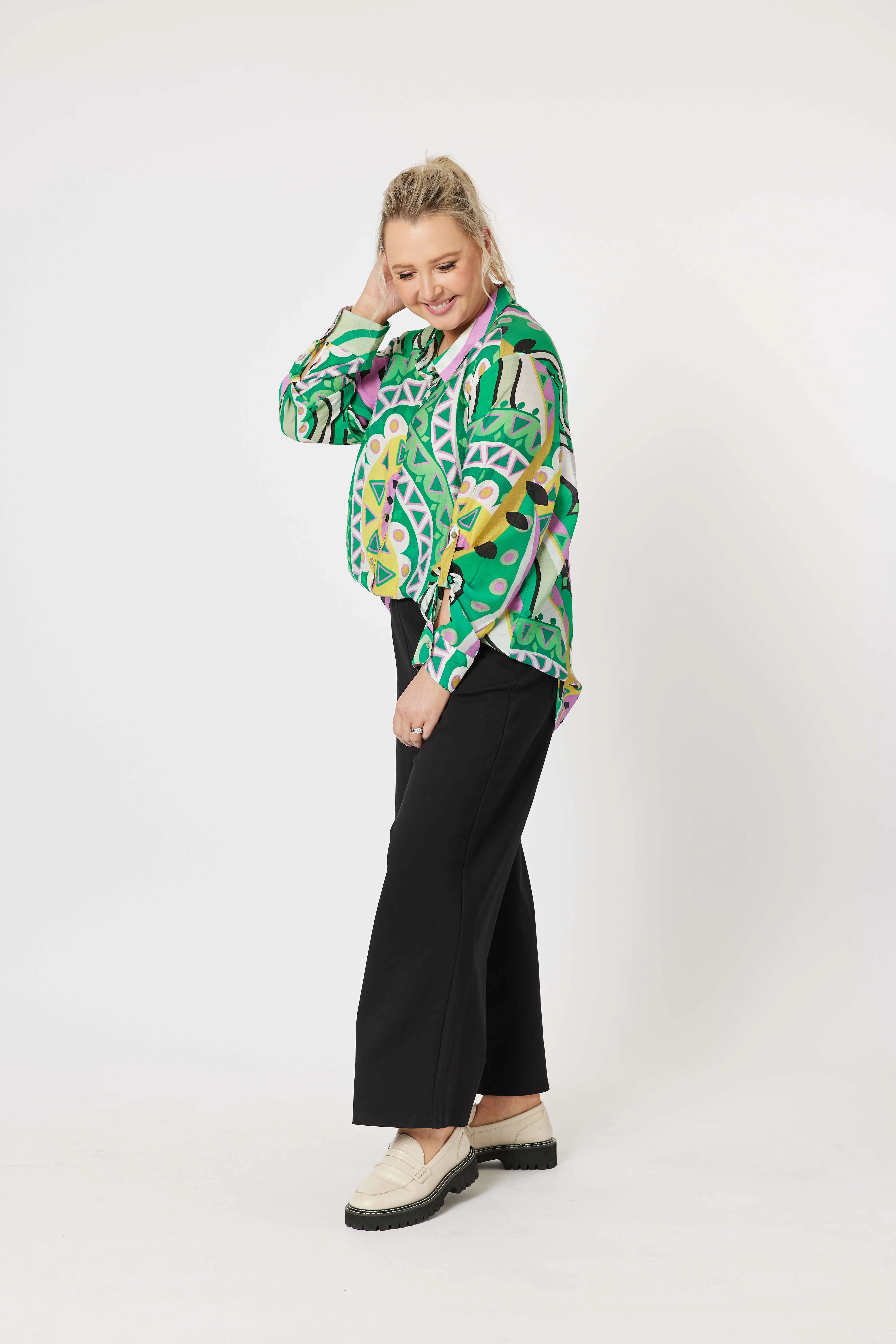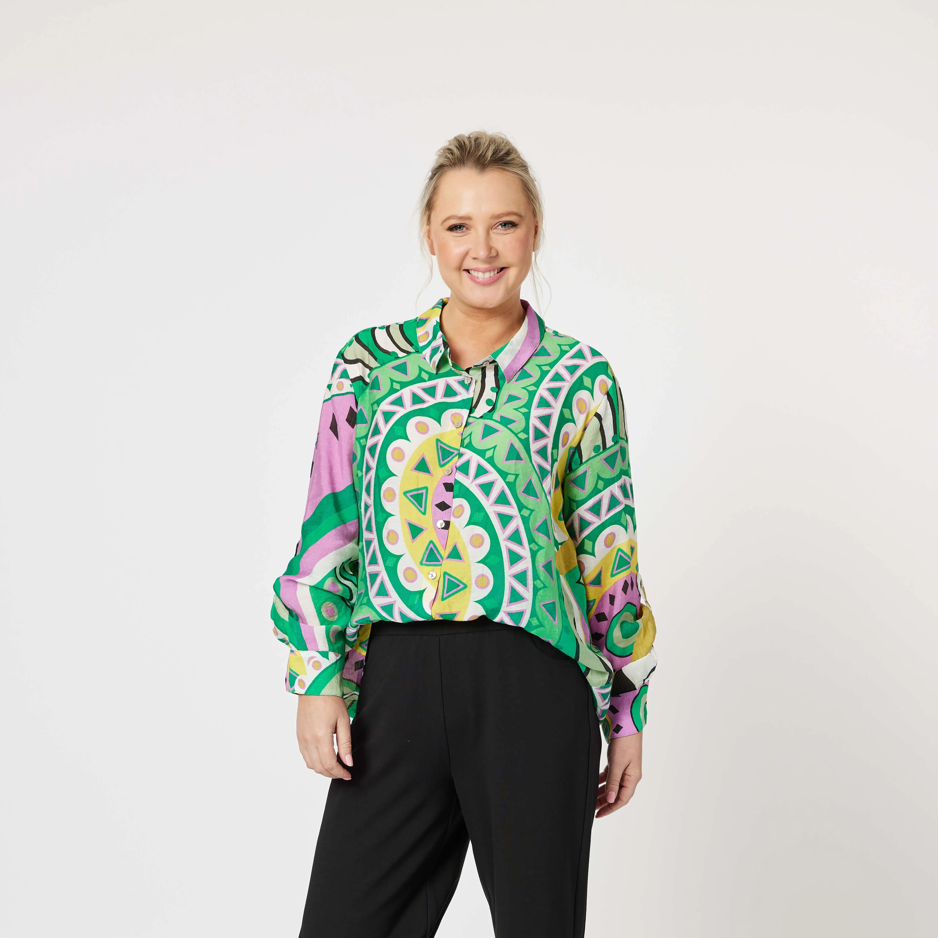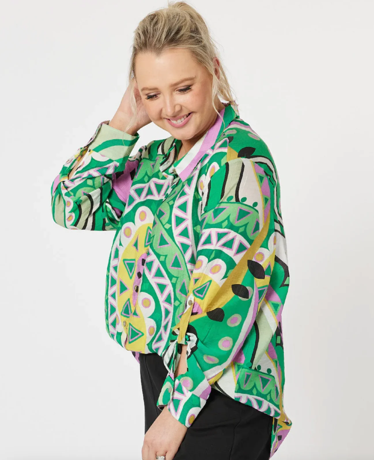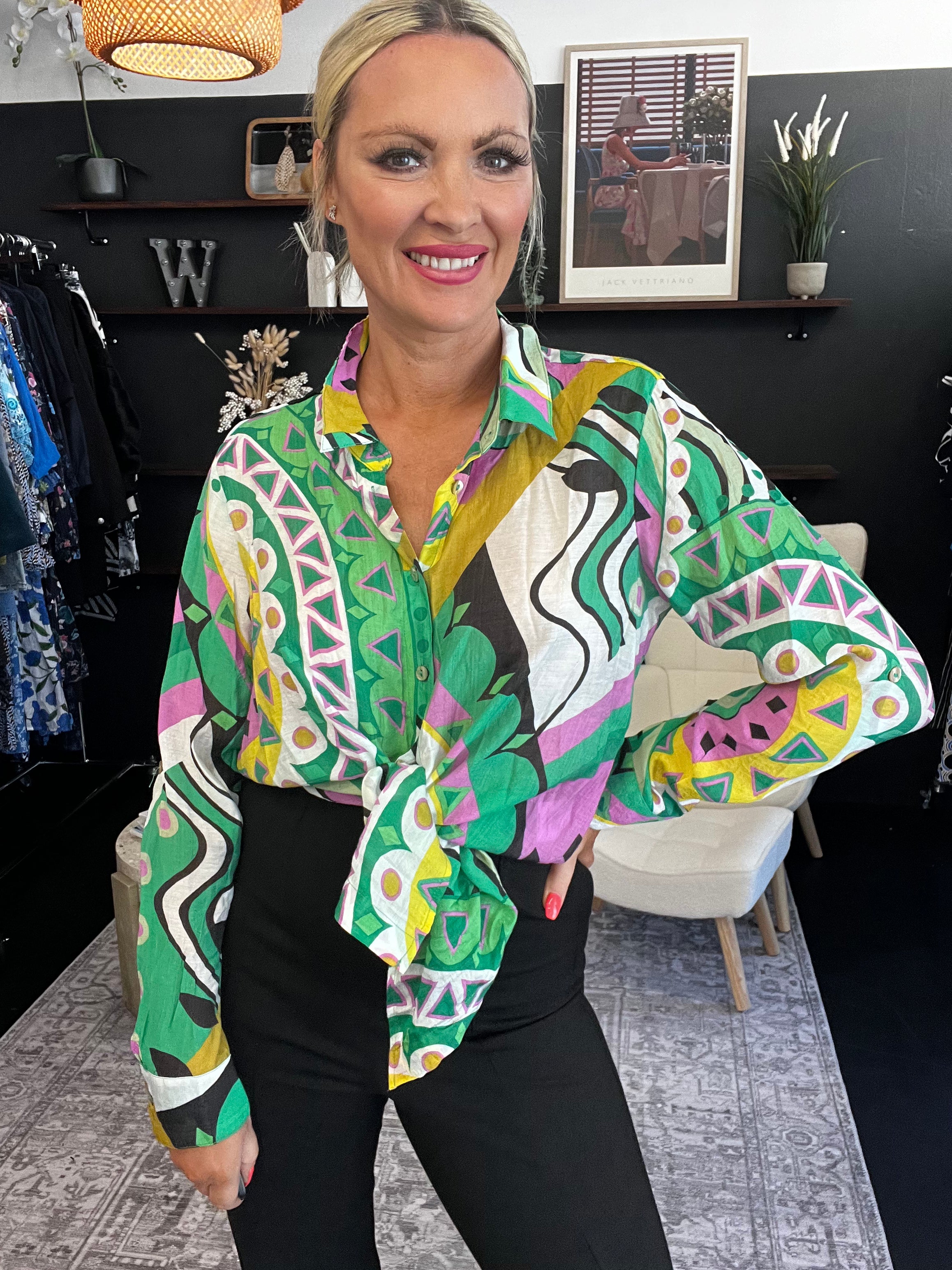 This eye-catching shirt brings a burst of color and energy to any wardrobe. Designed with a bold geometric pattern featuring shades of green, pink, yellow, and black, it is a true statement piece perfect for casual or artistic looks.