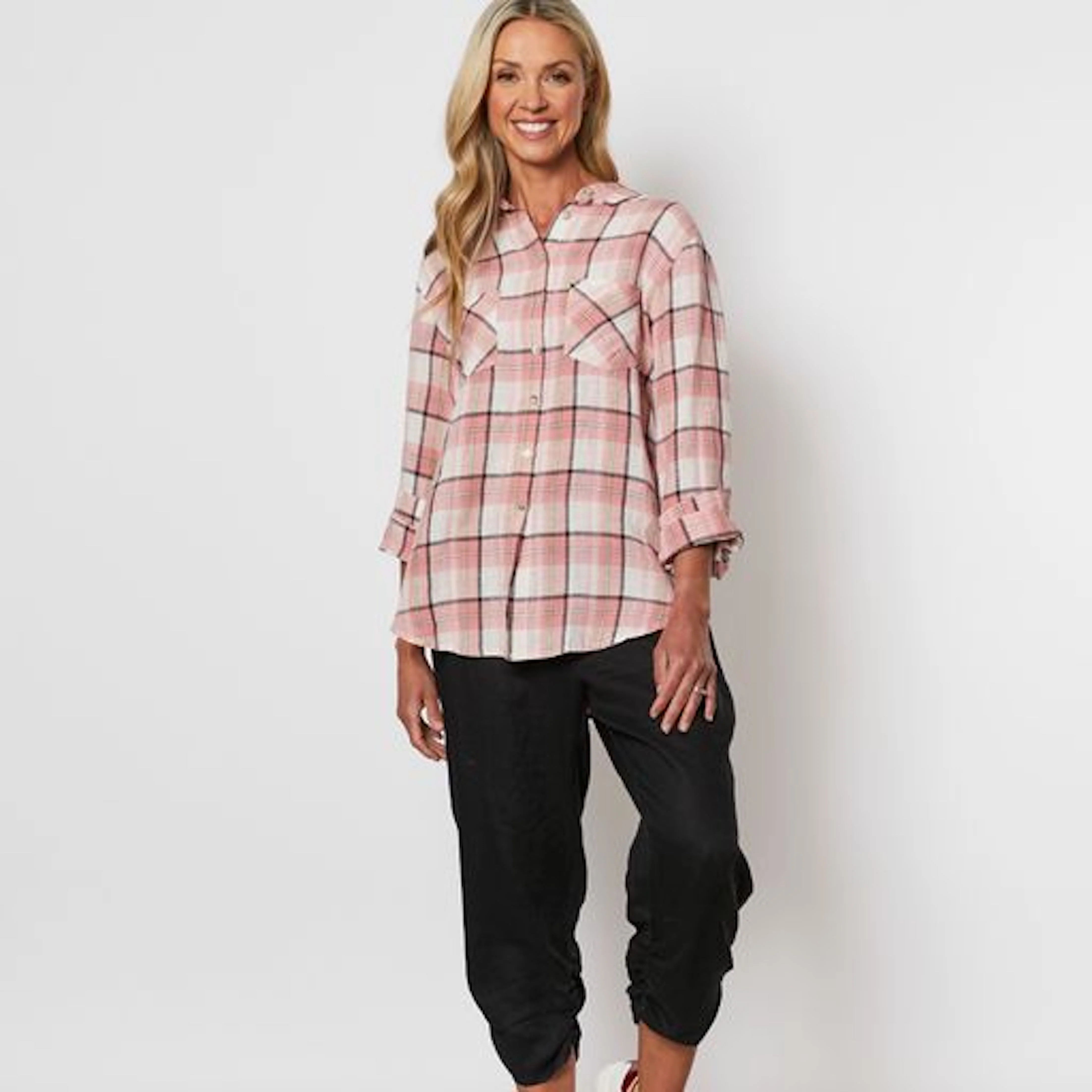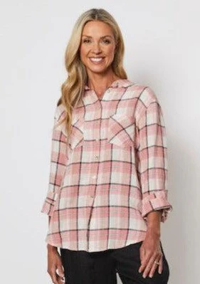 Embrace timeless style and comfort with this beautifully crafted pink and white plaid flannel shirt. Designed with a relaxed fit, it effortlessly combines casual elegance and versatility, making it a staple for every wardrobe.