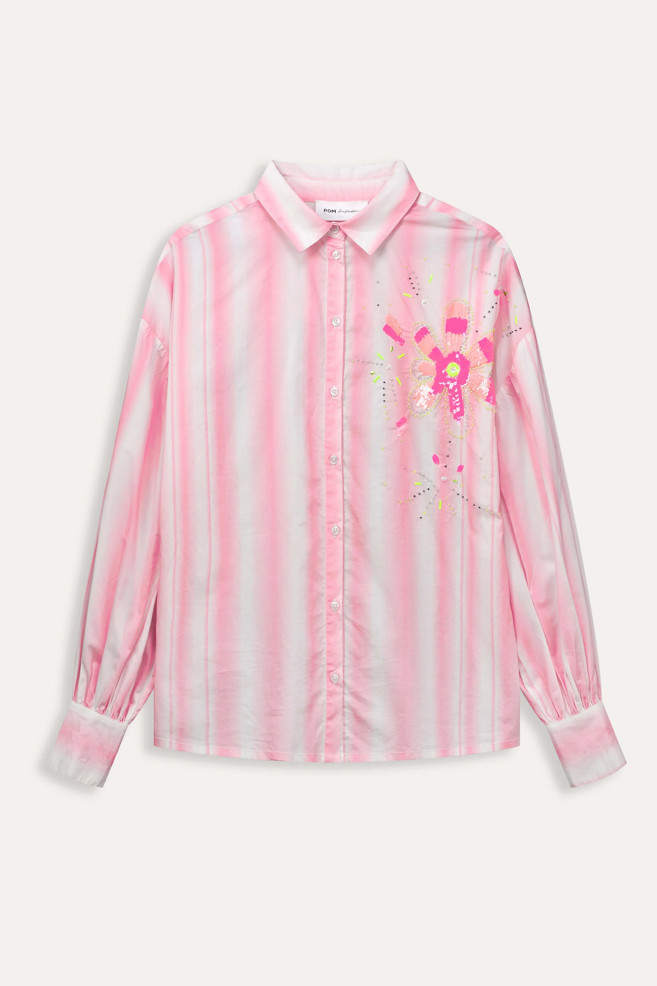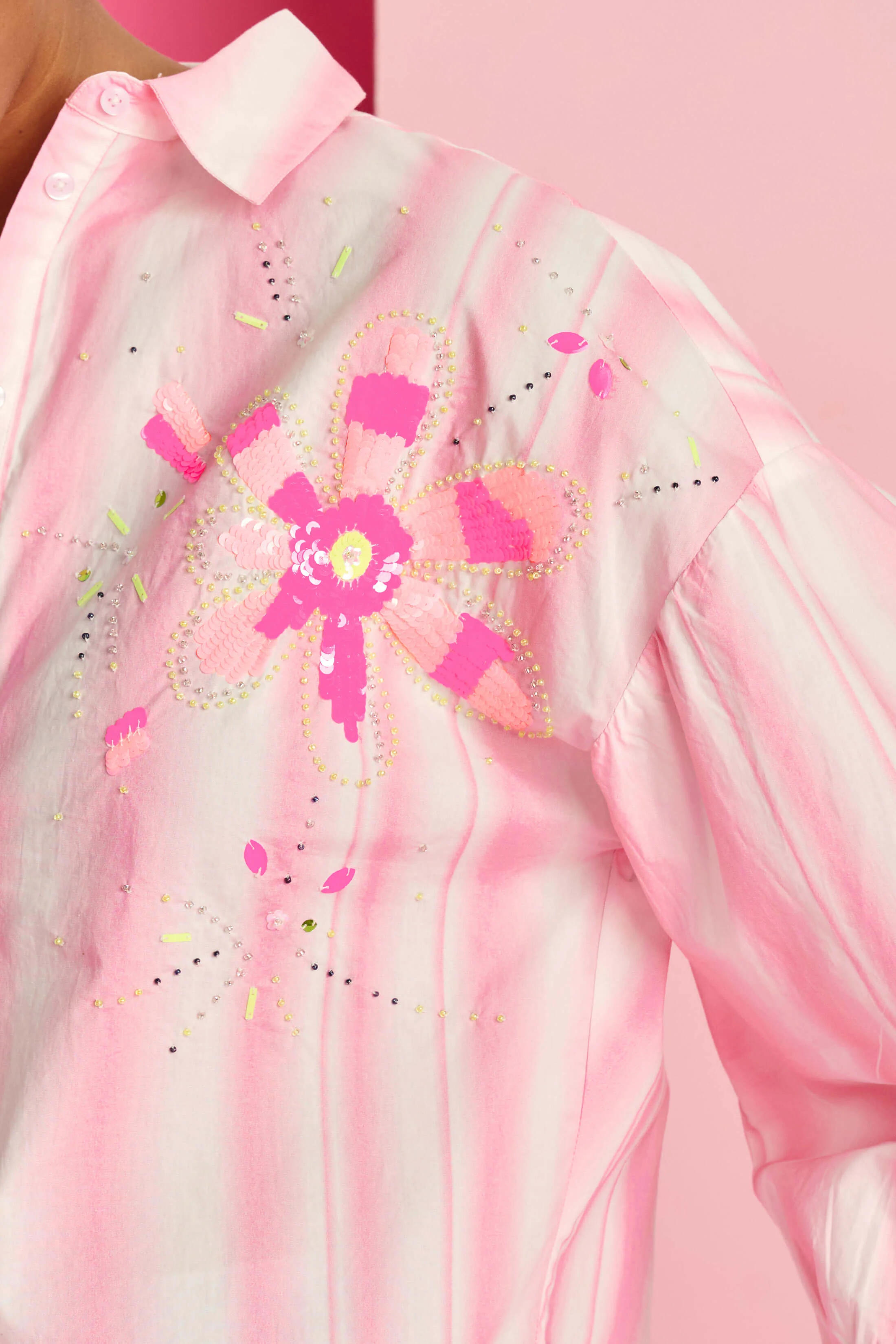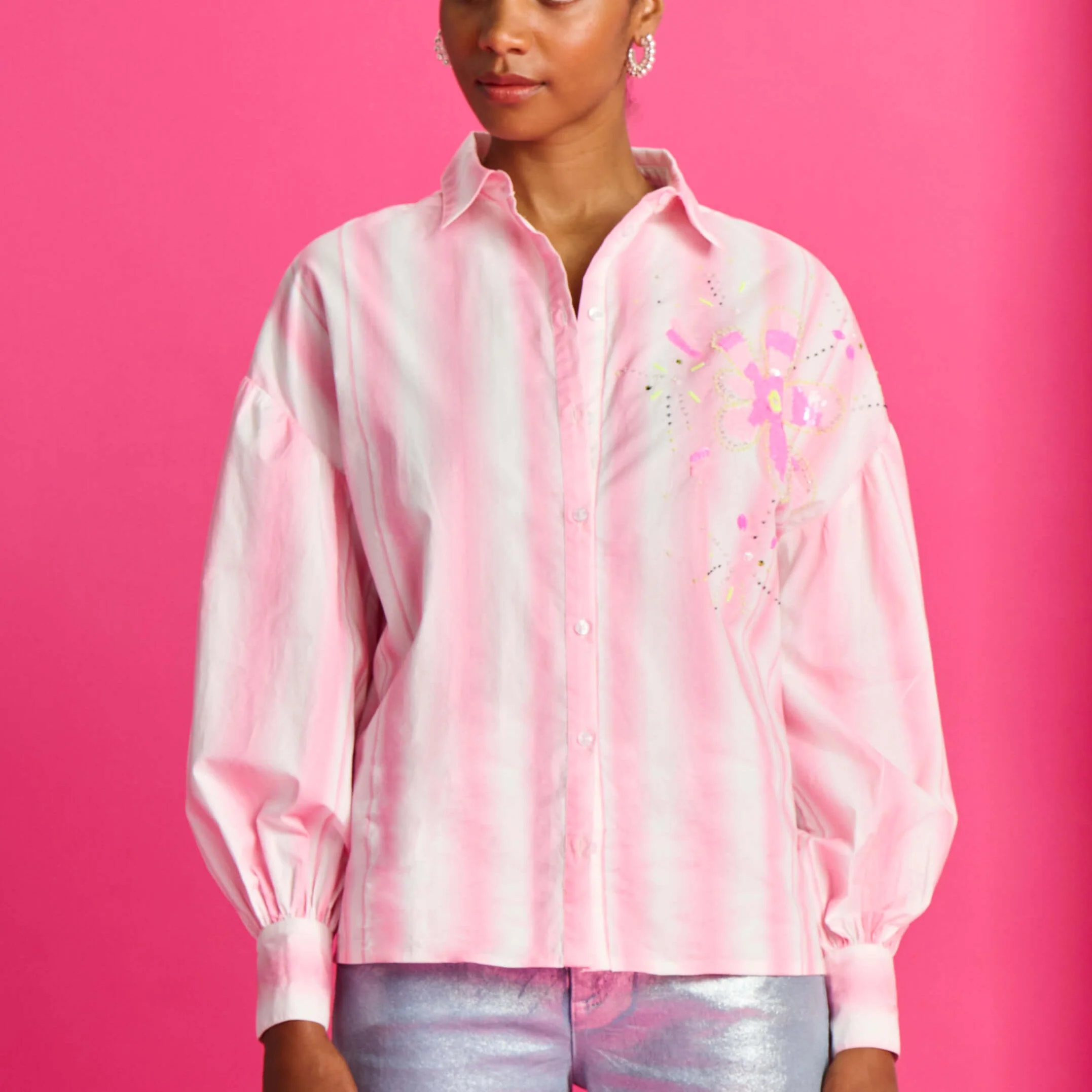 Adding to its charm, the shirt boasts subtle embellishments with delicate sequin floral patterns on the upper front panel, offering a hint of sparkle and playful elegance. Perfect for pairing with metallic trousers or denim, this standout piece brings modern chic to any outfit.
