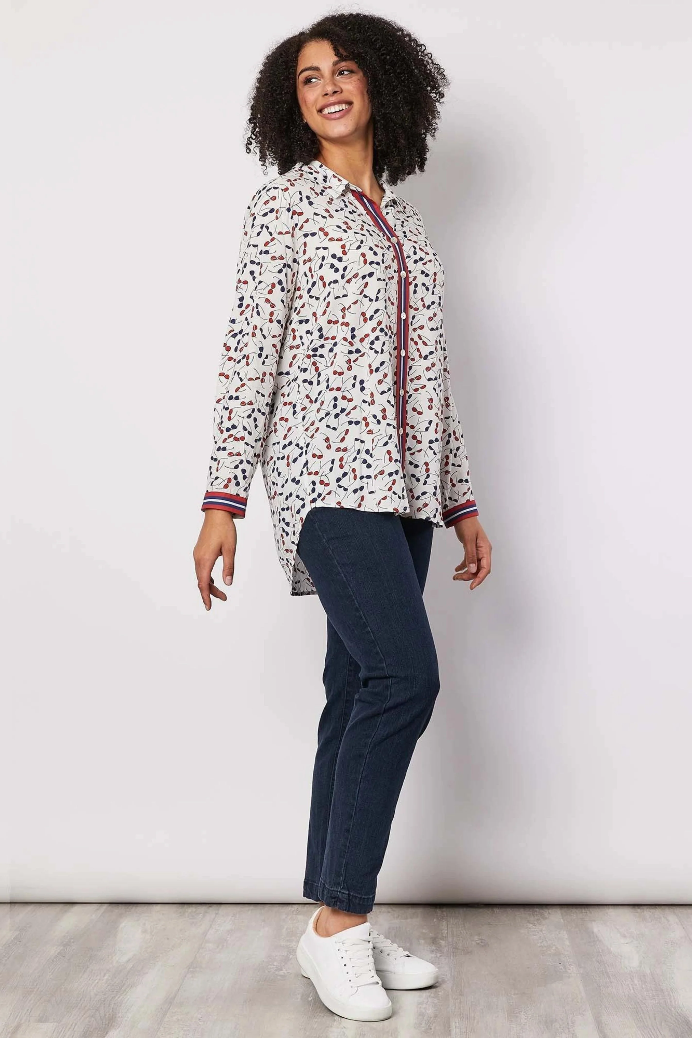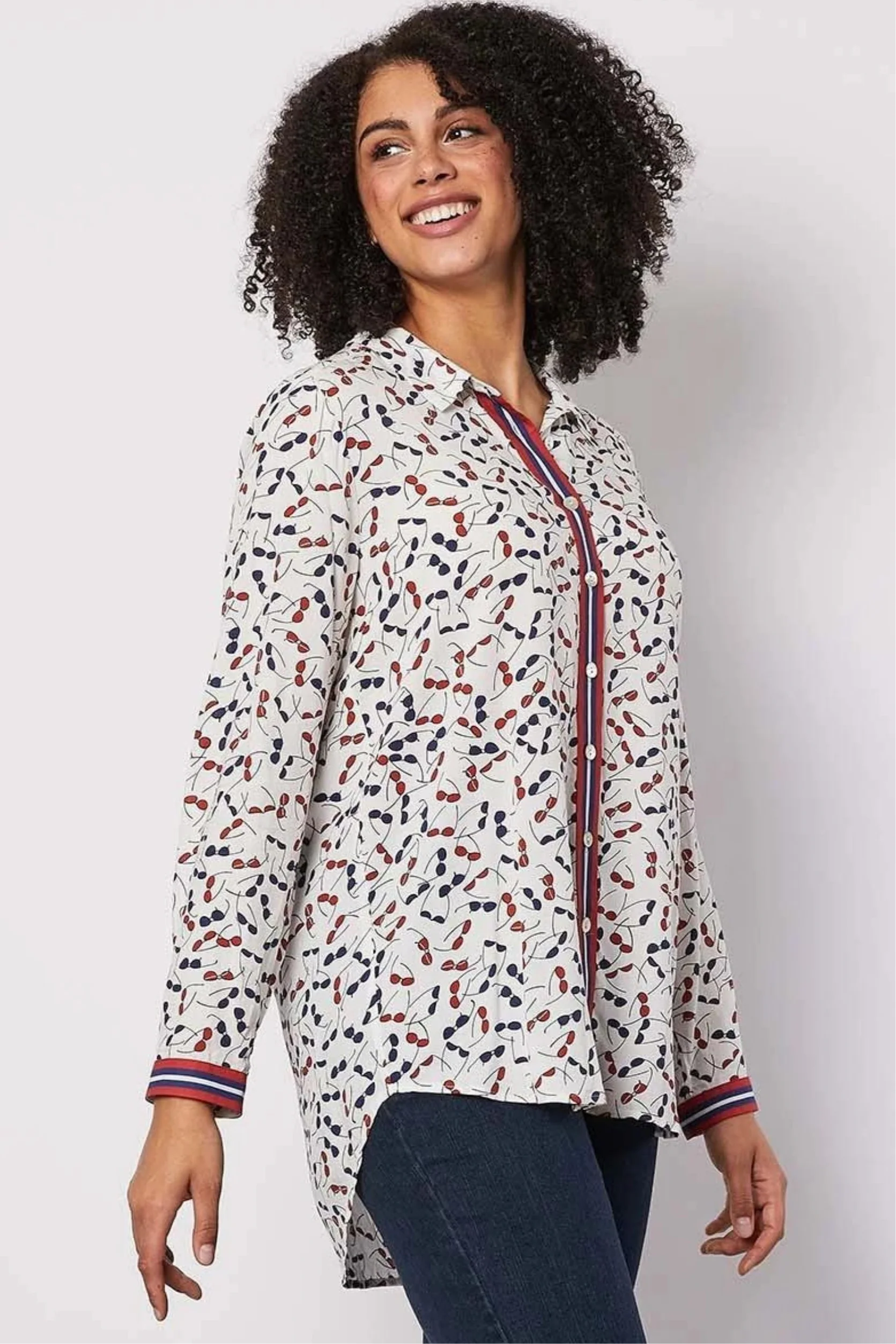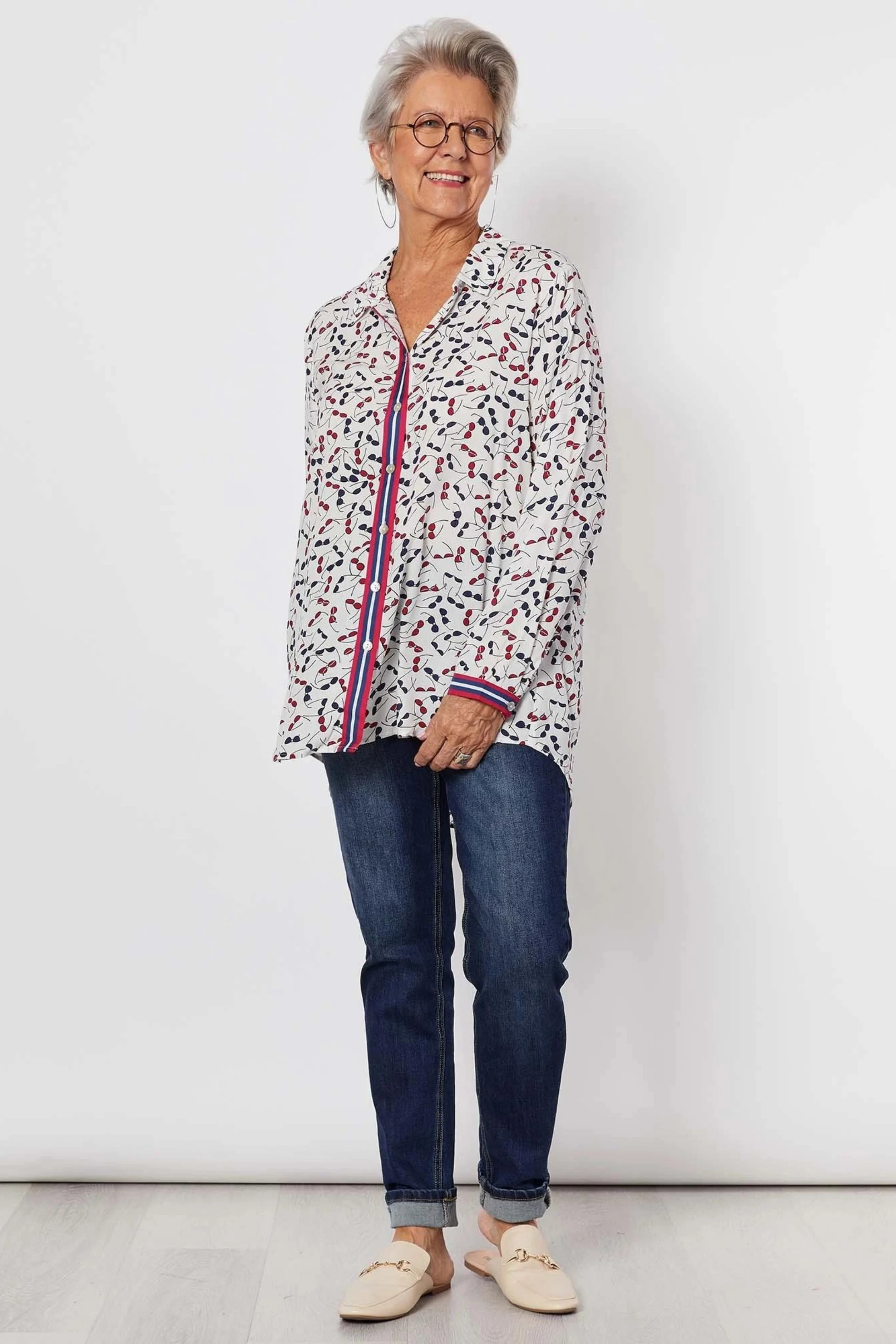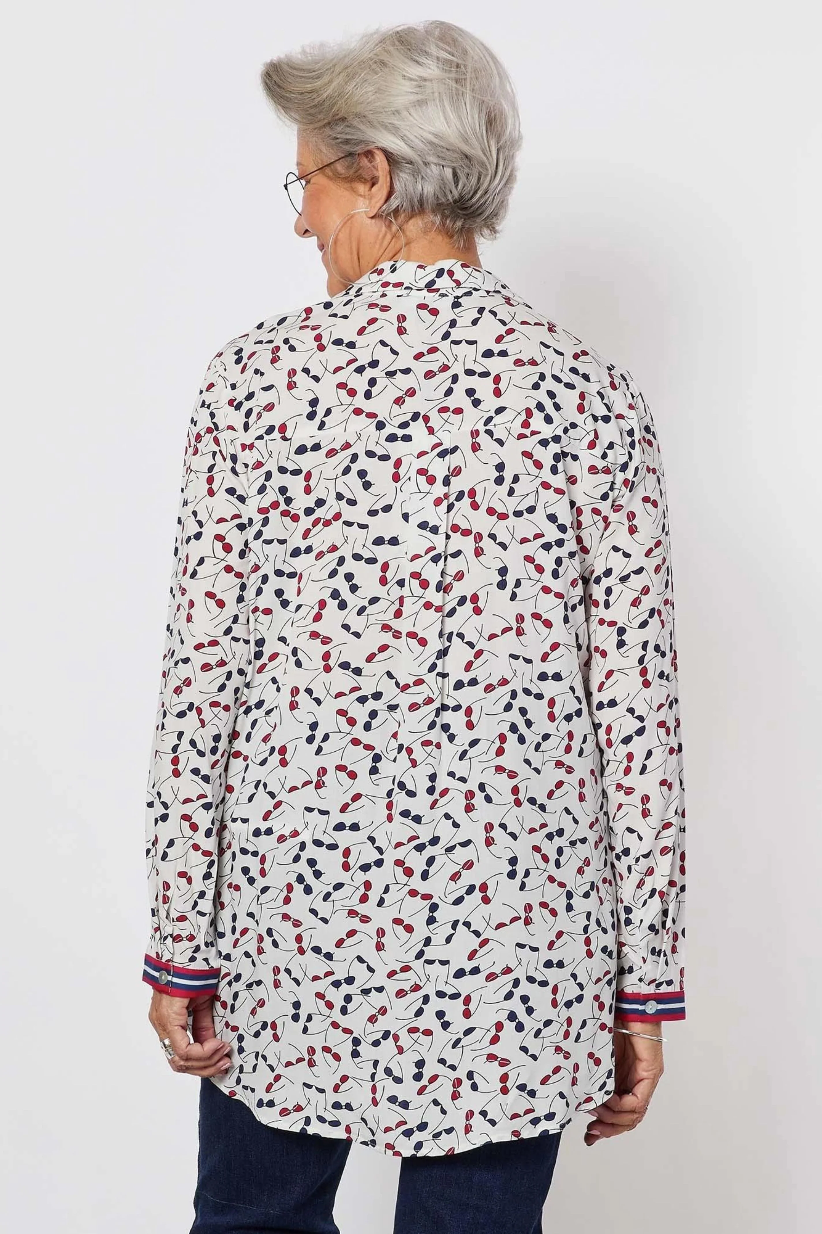 The shirt features an all-over print with vibrant cherry-inspired patterns in red and navy hues, adding a playful yet sophisticated touch to your wardrobe. A vertical button-up design with contrast piping enhances its structure, giving a sleek and polished look.
