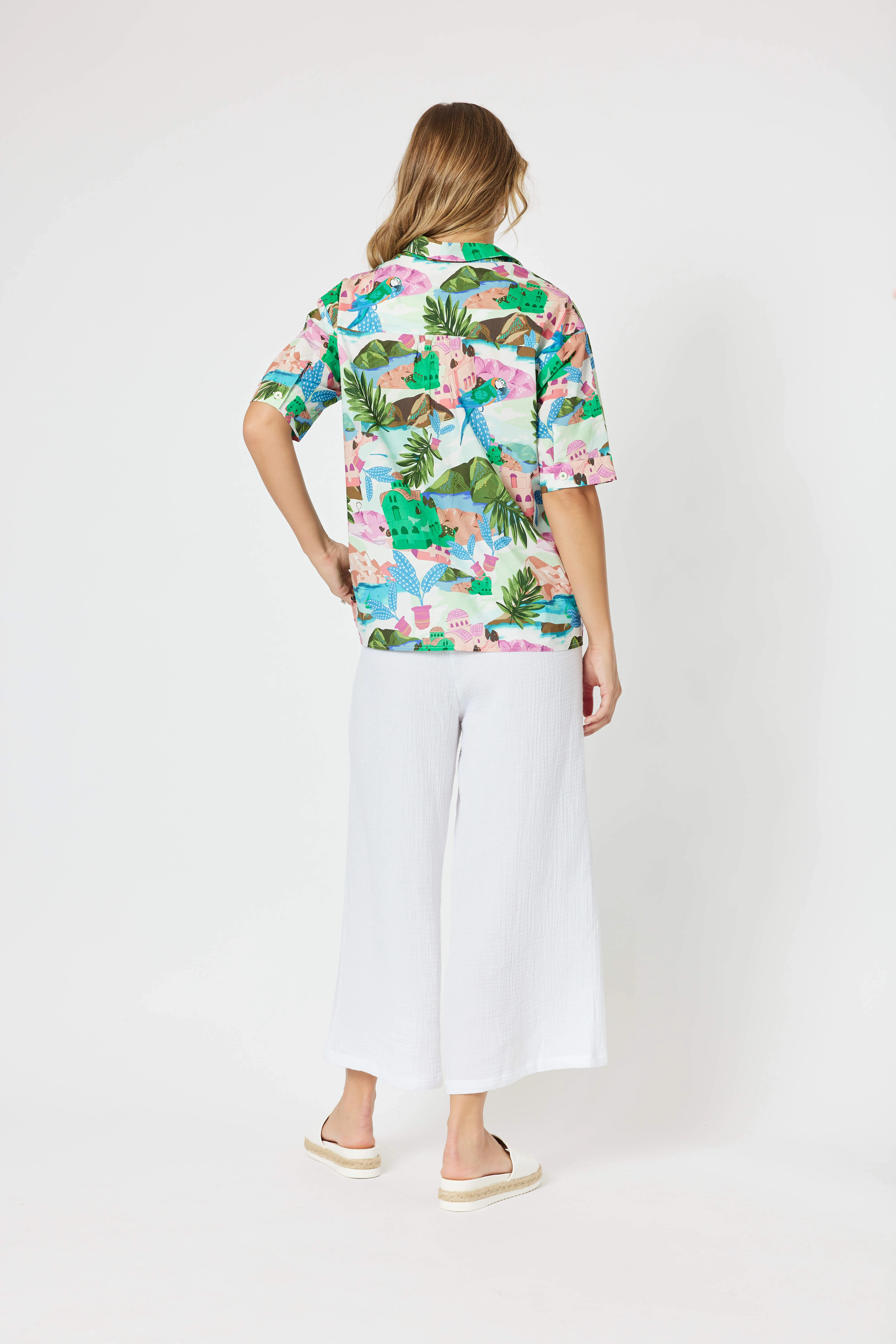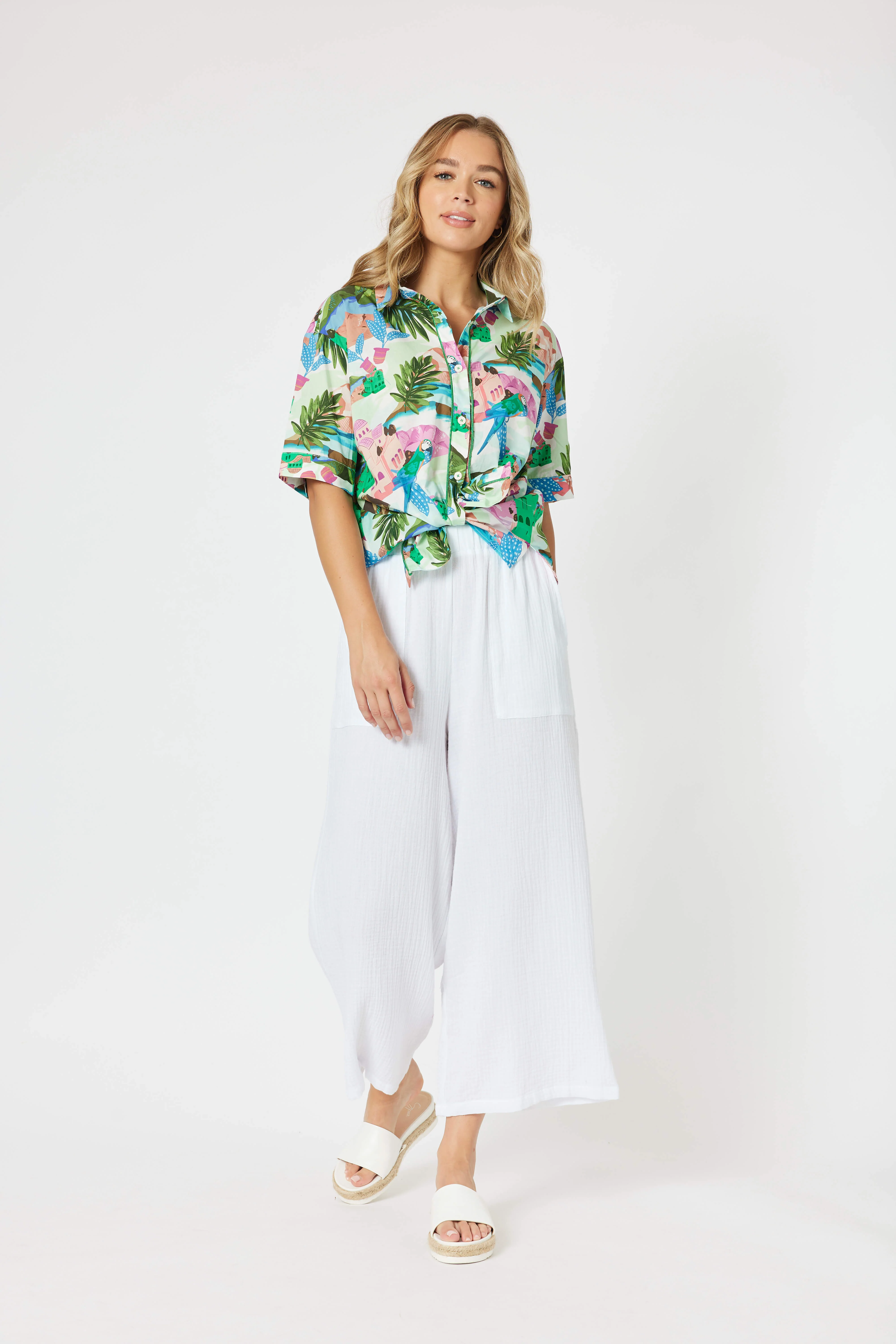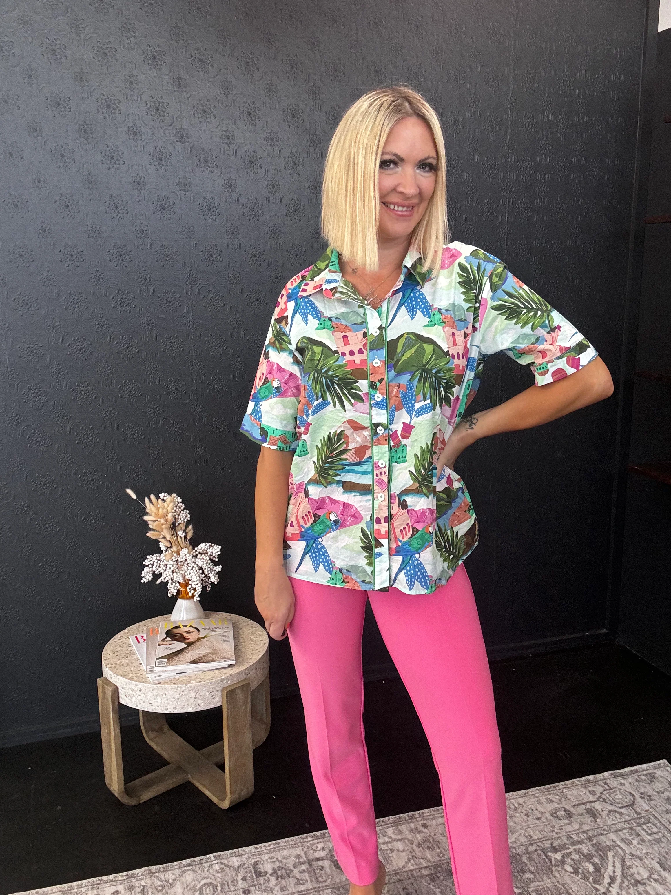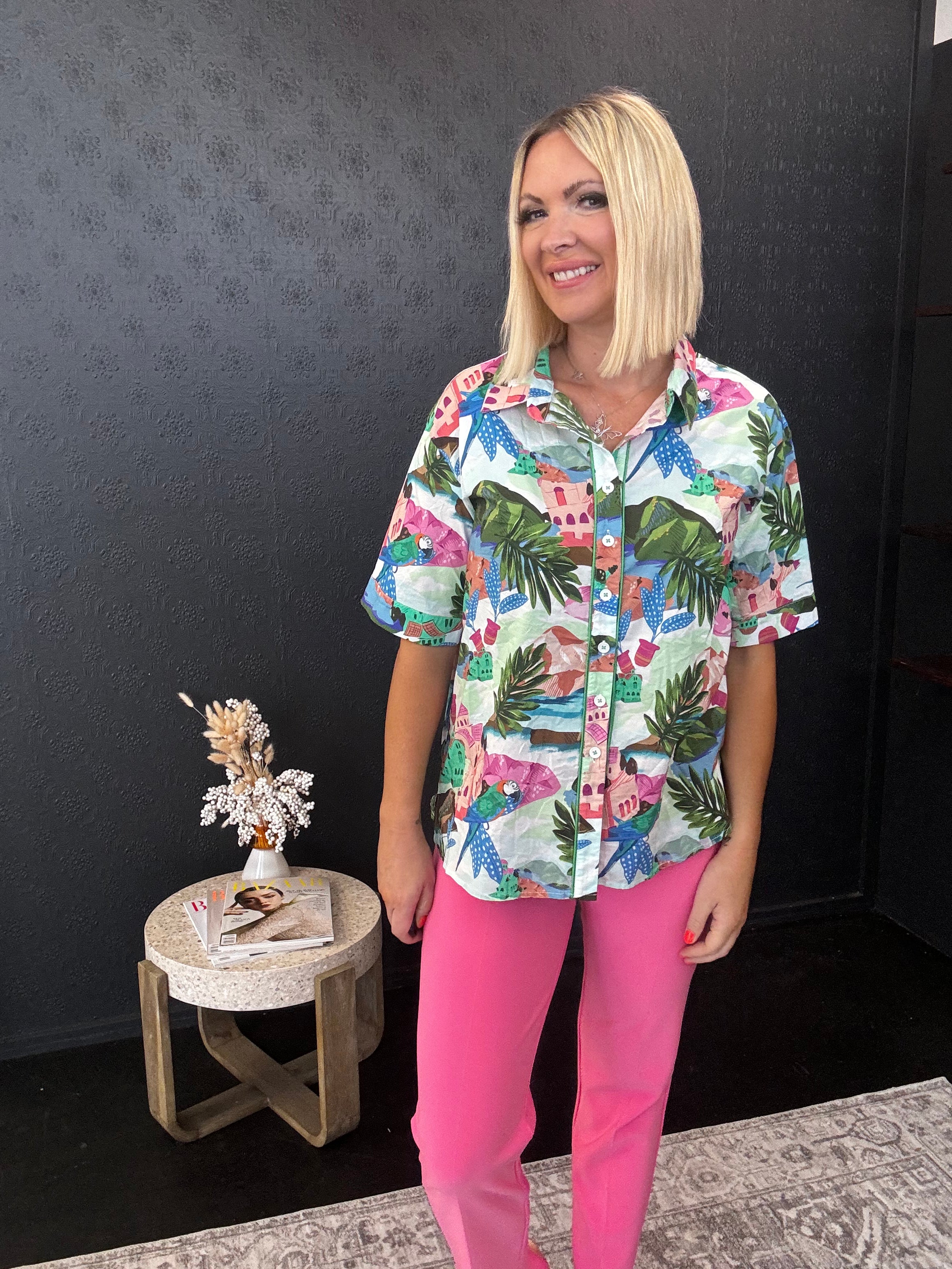 This vibrant tropical print shirt is perfect for making a bold fashion statement. Featuring a colorful array of palm leaves, parrots, and abstract shapes, it brings a touch of paradise to any wardrobe. The fresh mix of green, pink, blue, and white ensures a lively yet elegant style suitable for warm, sunny days.
