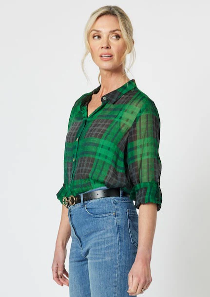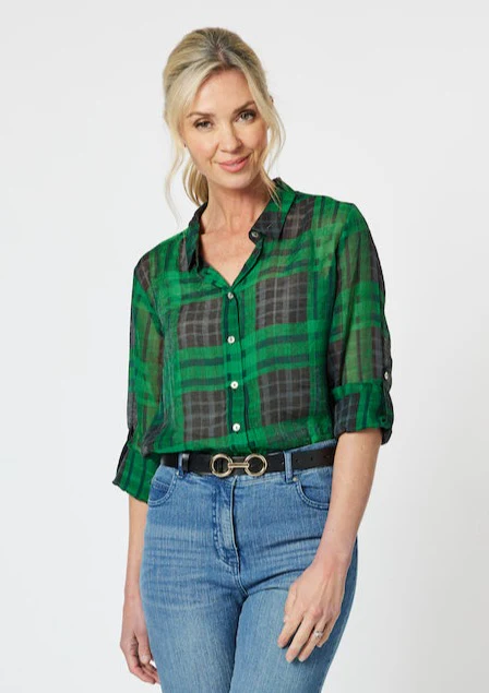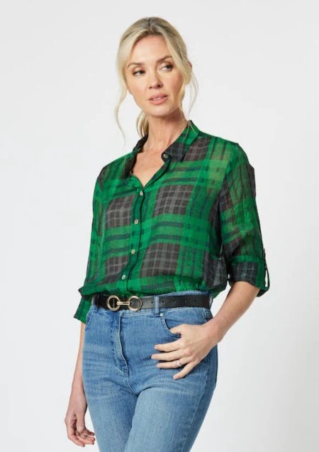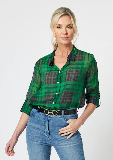 Featuring a classic button-down front, a relaxed fit, and a timeless plaid pattern in rich green and black tones, this blouse is versatile for both casual and smart-casual looks. The three-quarter sleeves add a modern touch, while the subtle transparency of the material lends a delicate and elegant charm.