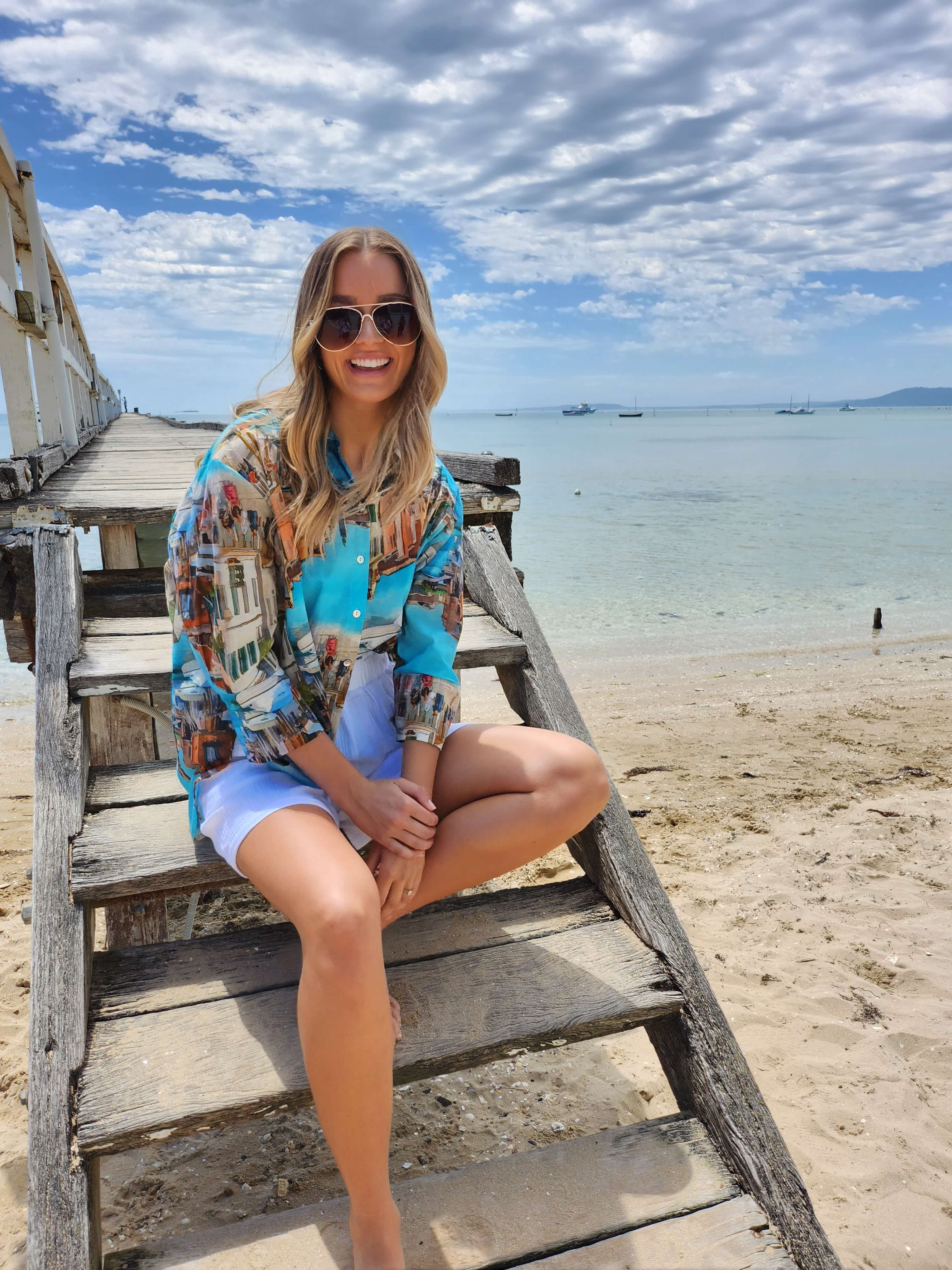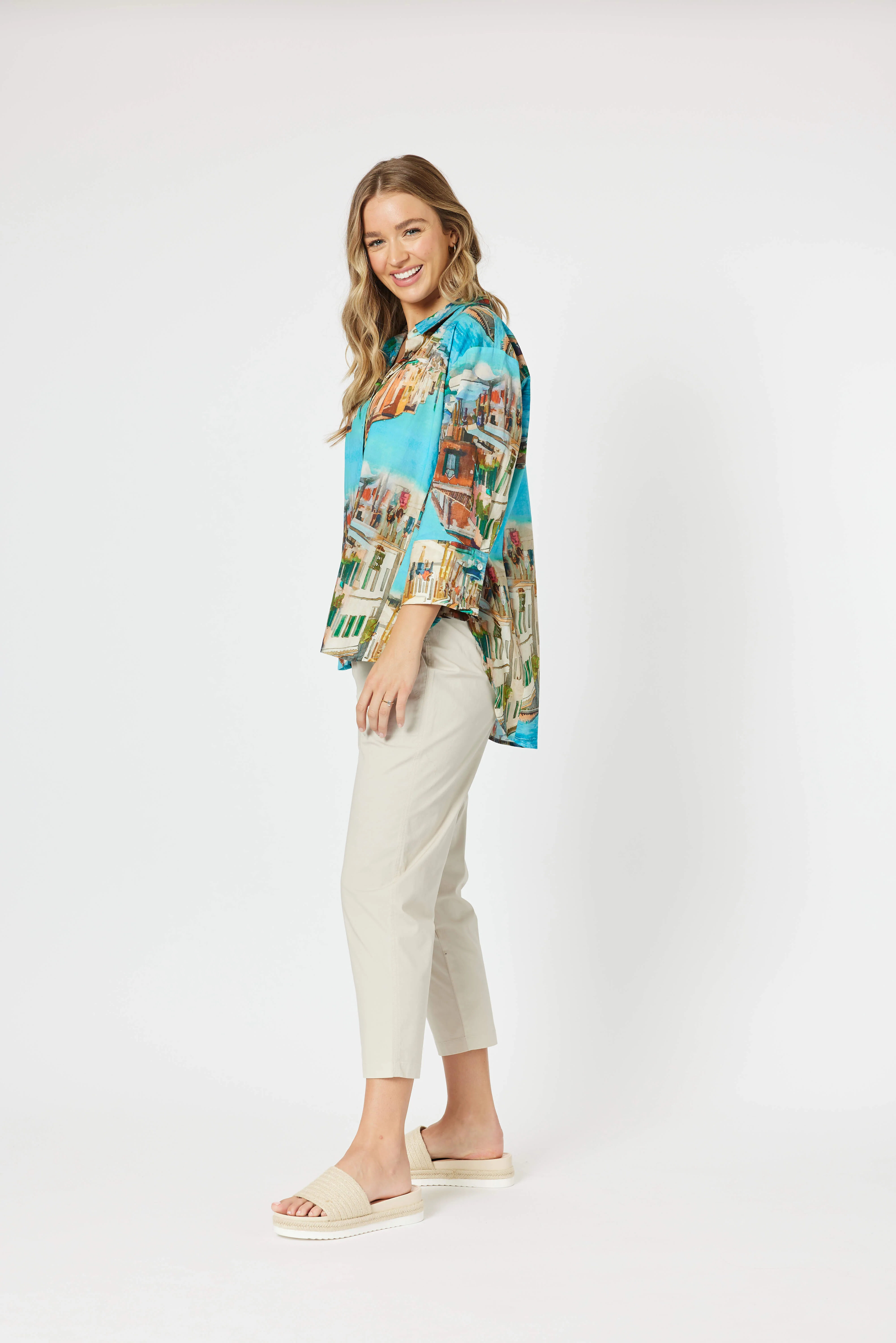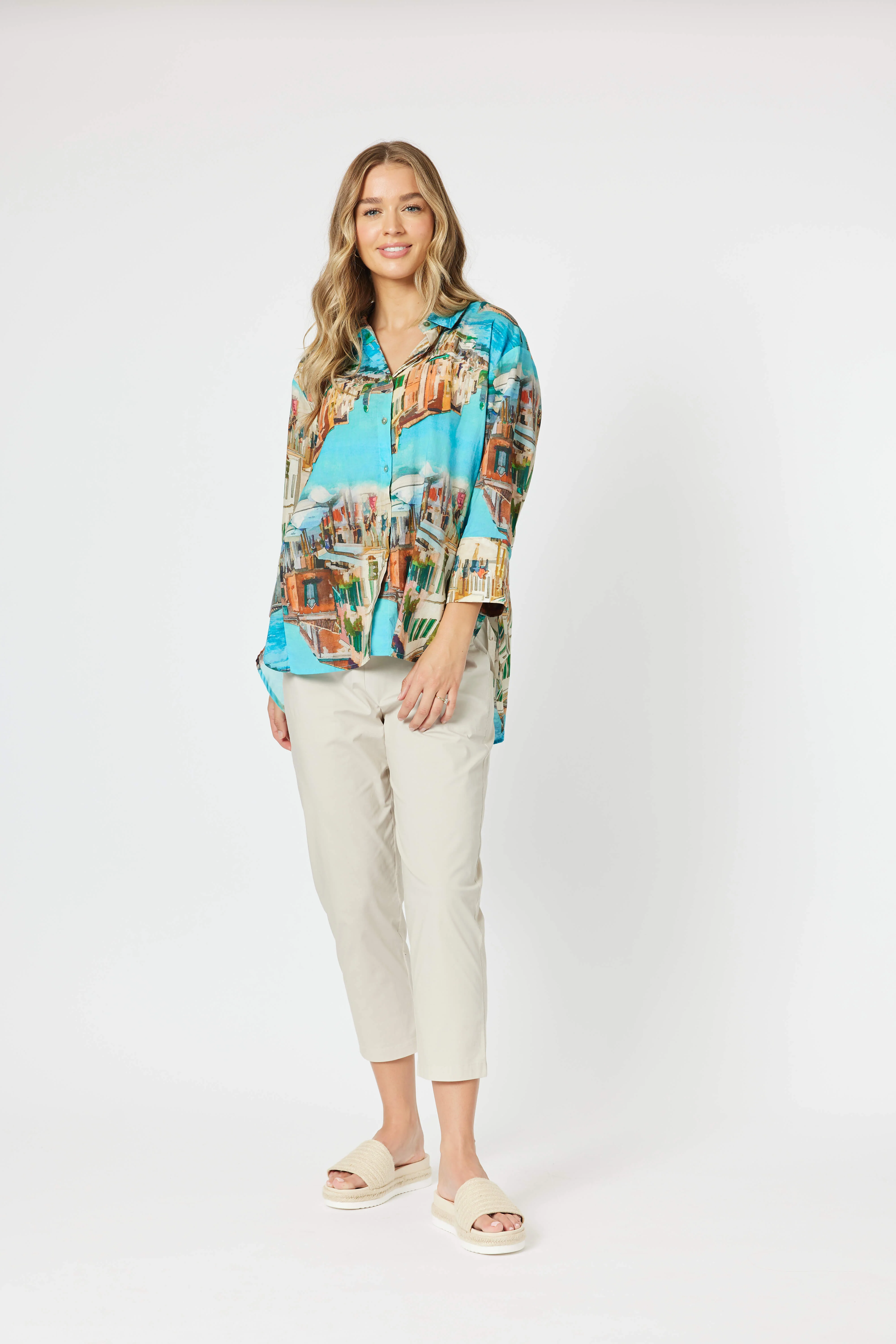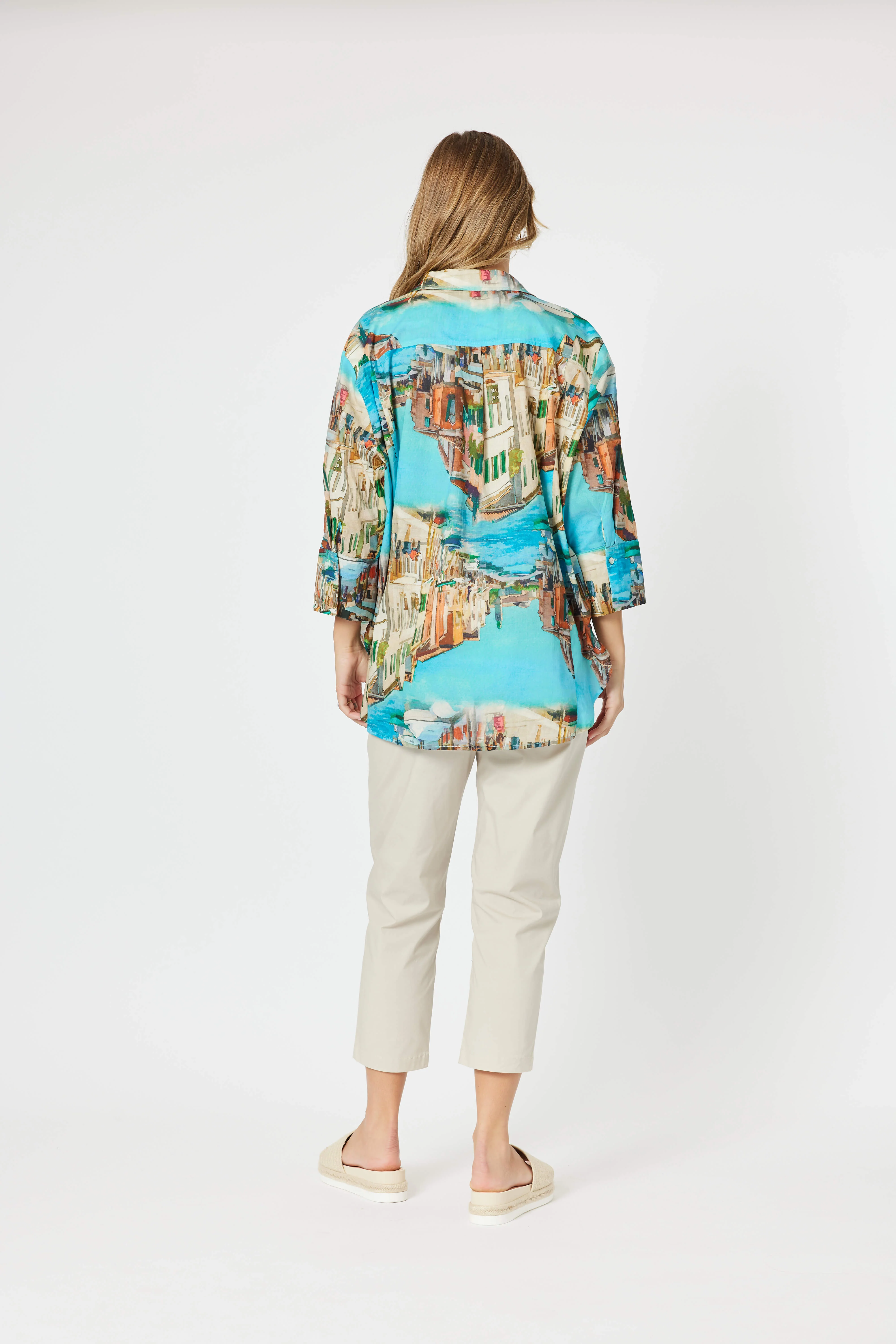 The shirt features an eye-catching artistic print with a scenic cityscape in a stunning blend of colors. Shades of turquoise, orange, and earthy tones merge seamlessly to create a bold and dynamic design, making it a statement piece for any wardrobe. The vivid pattern brings a modern and artistic flair to classic styling.