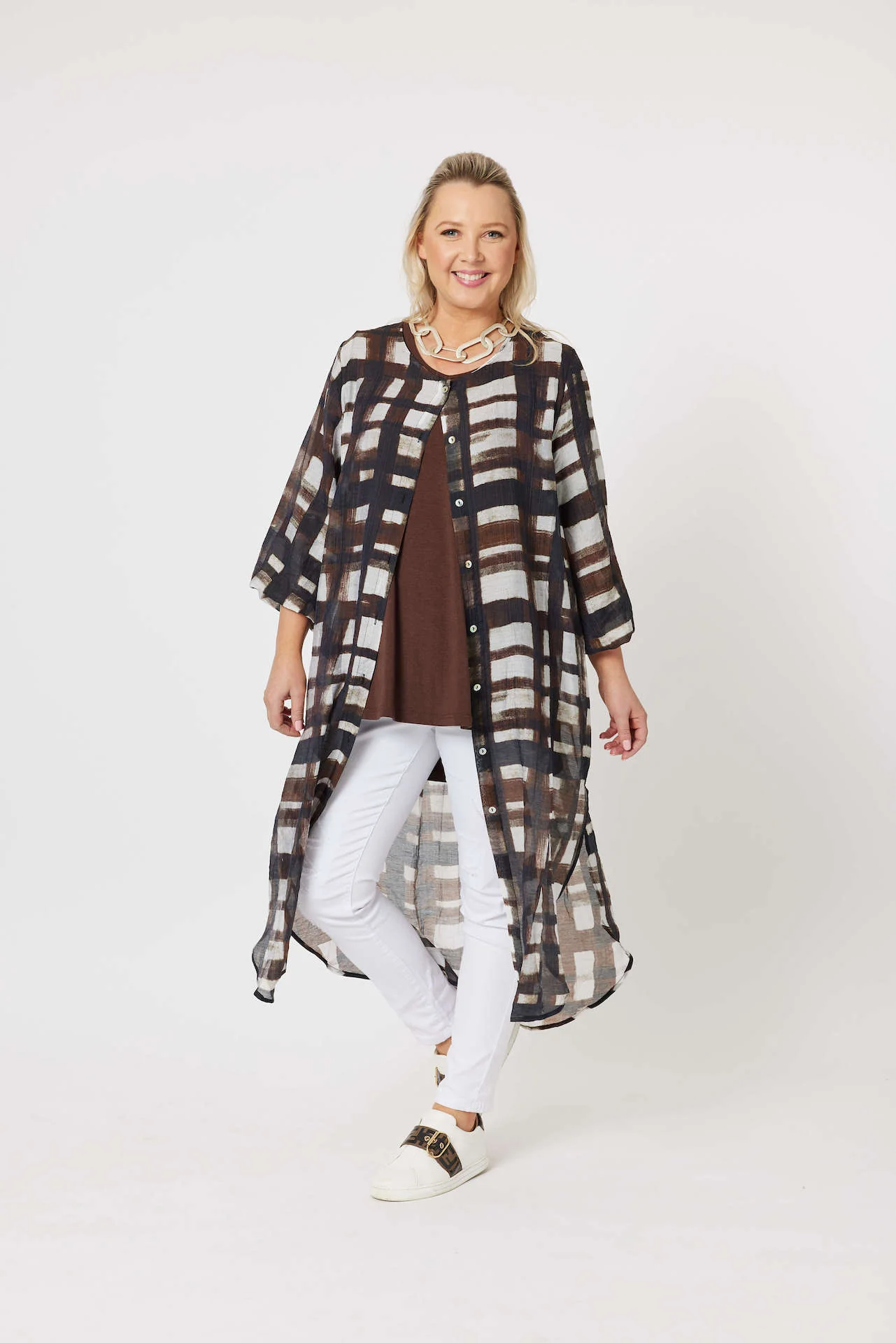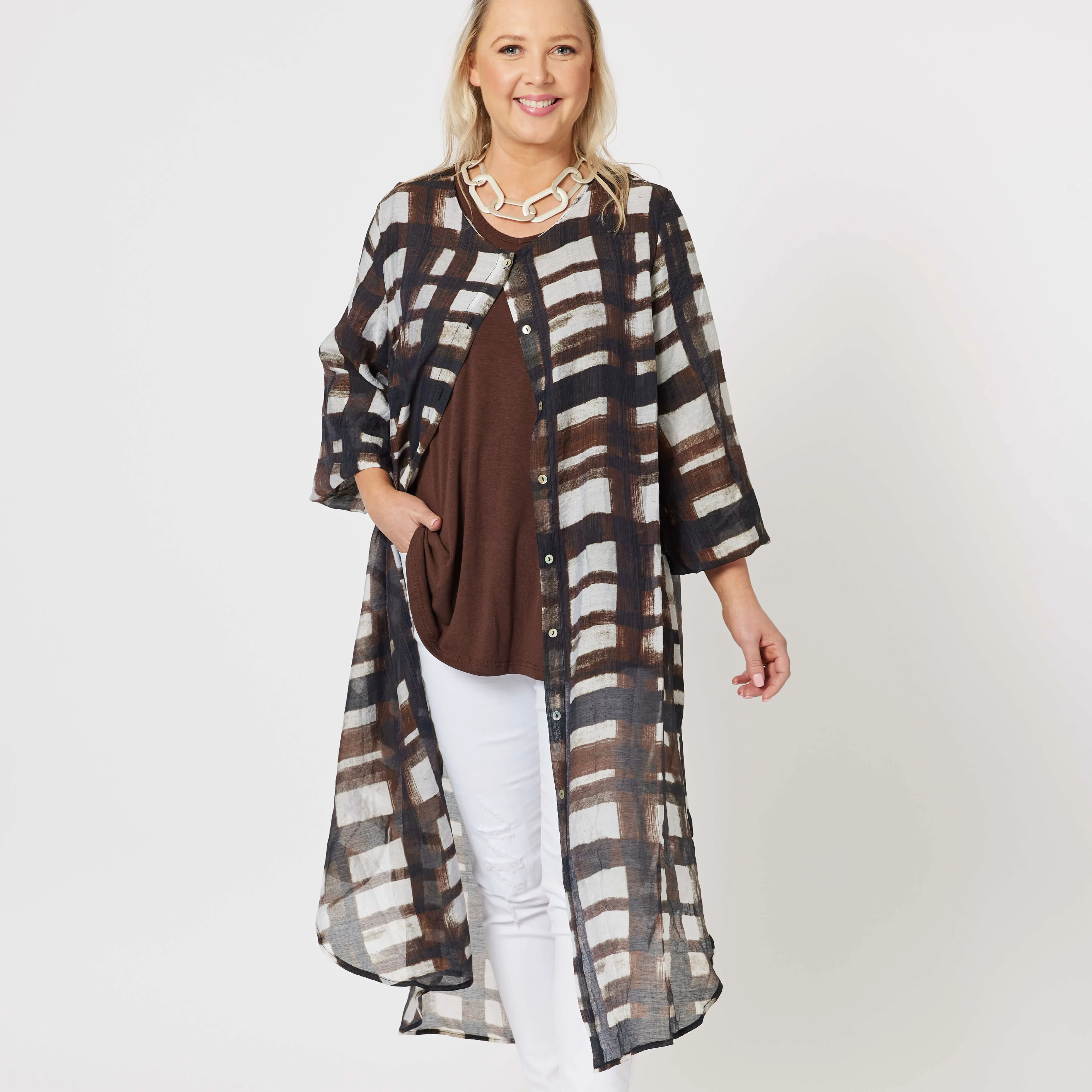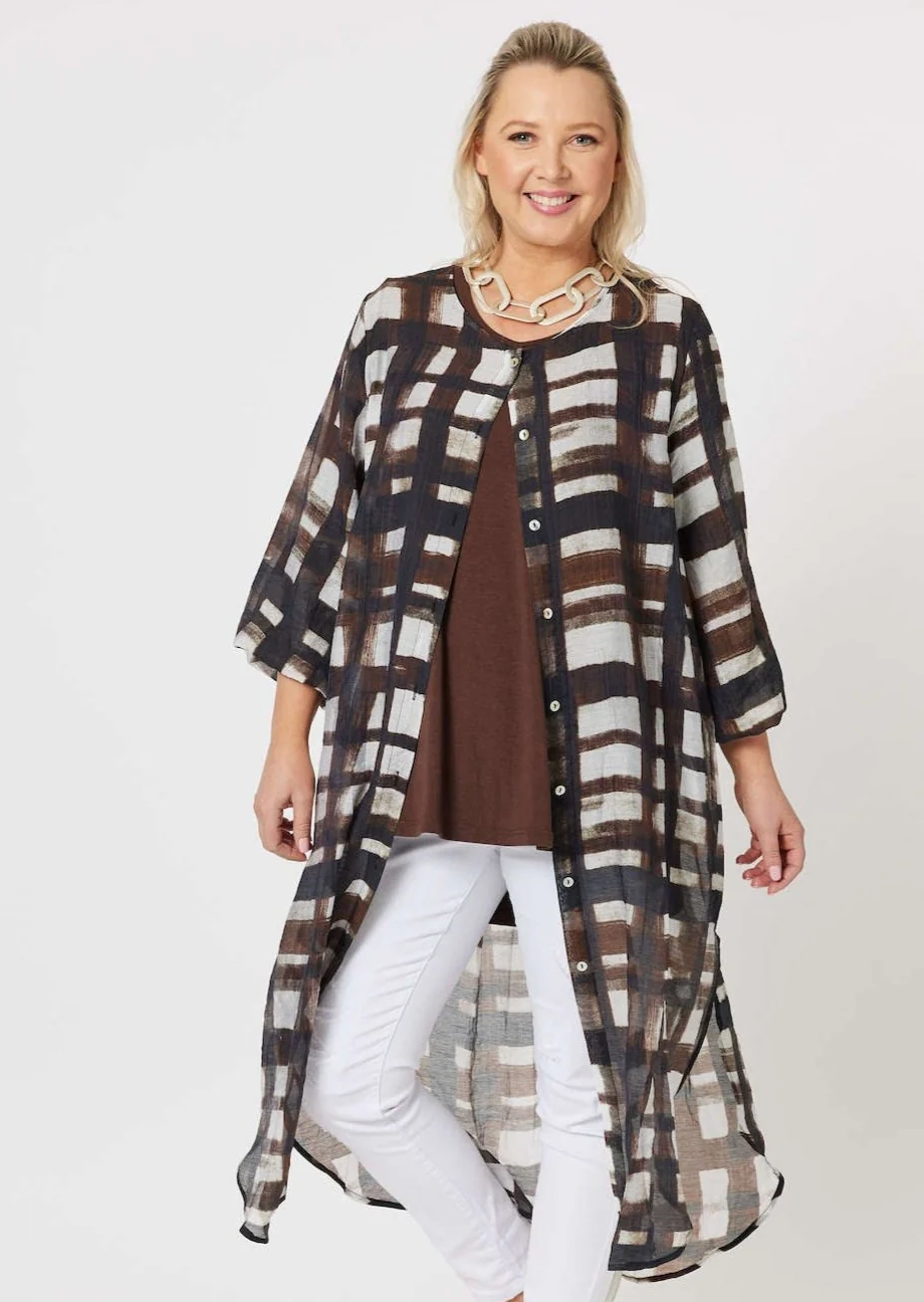 Embrace timeless style with this beautifully crafted longline shirt. The checkered design, featuring a mix of deep browns, neutral whites, and dark lines, creates an effortlessly modern and versatile look perfect for any season.